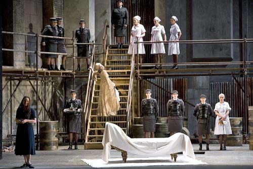 La co-production entre le Liceu de Barcelone et la Monnaie présentée actuellement à Bruxelles est de cette trempe. Guy Joosten (également chargé par La Monnaie de mettre en scène Salomé la saison prochaine) signe en effet un spectacle remarquable à plus d'un titre. Le décor est relativement simple mais son impact demeure puissant : l'arrière-cour d'un impressionnant palais, ceinturé de palissades métalliques et de fûts à l'abandon. L'esthétique du plateau et les uniformes militaires revêtus par les «servantes» évoquent une période fasciste dont la perversité intrinsèque résonne avec intelligence avec les vers de Sophocle. Lorsque la dramaturgie s'écarte volontairement du livret, on remarquera qu'elle parvient à doper le récit pour le mener vers des sommets de sauvagerie. Et ce, notamment dans un tableau final ahurissant, qui focalise la fin de l'œuvre sur le personnage d'Oreste. Le plateau resté statique sur l'ensemble de l'œuvre laisse alors apparaître l'intérieur du palais où l'on aperçoit Oreste, frère vengeur dominant les innombrables cadavres amoncelés des membres de la cour de Clytemnestre et Egysthe.