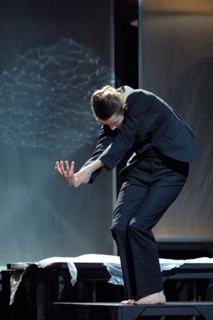 Elle se déroule avec quatre musiciens, percussionnistes, contrebassistes ou saxophoniste comme le compositeur. Ils entourent trois danseurs qui peuvent être amenés à manipuler des objets étranges, ciseaux, scies, lances en bois. Pieds nus, ils sont vêtus de costumes masculins noirs et évoluent sur des praticables transformables. Des performances picturales étranges surgissent parfois, telle la femme pinceau qui écrit un tableau avec ses pieds teintés de sang. Parfois même les danseurs deviennent des personnages fantomatiques sans visages. Tous les arts deviennent alors arts de la scène.