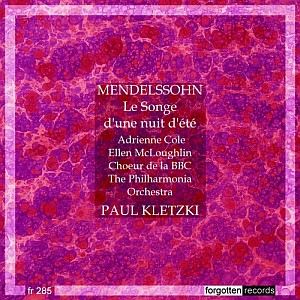 Felix Mendelssohn (1809-1847) : Le Songe d’une Nuit d’Été, ouverture op. 21 et musique de scène op. 61. Franz Schubert (1797-1828) : Rosamunde, ouverture et musique de scène D. 797. Adrienne Cole et Eileen McLoughlin, sopranos ; Chœurs de la BBC (Le Songe d’une Nuit d’Été). The Philharmonia Orchestra, direction : Paul Kletzki. 2 CD-R séparés Forgotten Records fr285 et fr295. Pas de code barre. Enregistré les 4 et 5 février et 12 avril 1954 (Le Songe) et les 7 et 9 juillet 1952 (Rosamunde) au Kingsway Hall, Londres. ADD [mono]. Pas de notice. Durée : 41’31 et 44’18.