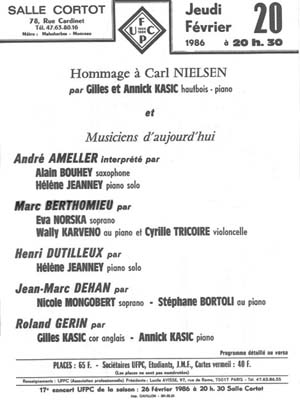 Une fois n'est pas coutume, nous allons réveiller un souvenir de concert, le jeudi 20 février 1986. Salle Cortot à Paris. Deux amis interprètes, membres de l'Association Française Carl Nielsen, Gilles et Annick Kasic, respectivement hautboïste et pianiste, proposent dans le cadre d'un «Hommage à Carl Nielsen», les deux Fantaisies pour hautbois et piano composées en 1889, jamais données en France. Le compositeur n'a que 24 ans quand il compose cet opus 2.