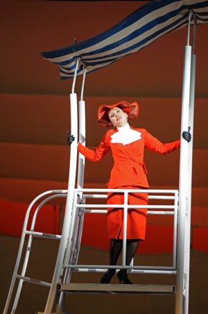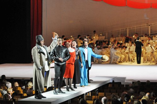 Ce Voyage a Reims n'est pas une nouveauté. Le Théâtre du Châtelet l'a notamment accueilli dans la même scénographie et avec une distribution presque identique en décembre 2005, production qui a fait l'objet d'une publication en Dvd chez Opus Arte. La mise en scène d'Alain Maratrat n'a pourtant rien d'exceptionnel et se limite pour l'essentiel à un concept scénique, réalisé par Pierre Alain Bertola ; l'orchestre est placé en fond de plateau, logé dans une sorte de cyclorama que parcourt une rampe inclinée, et les chanteurs occupent l'avant-scène, étendue pour l'occasion par-dessus la fosse d'orchestre et prolongée par une estrade de type défilé de mode jusqu'au milieu du parterre. Conçu pour une autre salle, ce dispositif s'adapte hélas mal au Festspielhaus de Baden-Baden, puisqu'il faut recourir à des projections vidéos pour que le public des premier et second balcons puisse voir les multiples entrées ou déplacements des chanteurs sur ce praticable. Quant à les entendre, ce même public ne bénéficie plus alors que de la réverbération des voix… Pour le reste, Alain Maratrat est souvent à court d'idées pour animer le plateau et, en maints moments, les chanteurs déambulent de cour à jardin sur l'espace scénique déshabité ou se rassemblent à la rampe en rangs d'oignons. Avec un livret pourtant linéaire et simplissime à expliciter, le metteur en scène n'offre qu'une suite de scènes sans cohérence dramatique. Les deux duos Corinna-Belfiore et Melibea-Libenskof sont pourtant un peu mieux traités et font l'objet d'actions dramatiques plus travaillées. Seuls les costumes ingénieux et aux vives couleurs d'Anna Kiknadze soutiennent un peu l'intérêt d'un spectacle globalement sans nerf, sans imagination et soporifique.