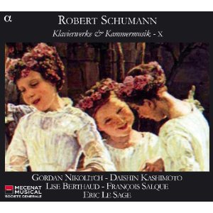Robert Schumann (1810-1856) : Quintette op. 44 ; Quatuor op. 47. Gordan Nikolitch, Daishin Kashimoto, violons ; Lise Bertaud, alto ; François Salque, violoncelle ; Eric Le Sage, piano. CD Alpha 166. Code barre : 3760014191664. Enregistré en novembre 2009. Livret en : français, anglais. Durée : 57’13.
