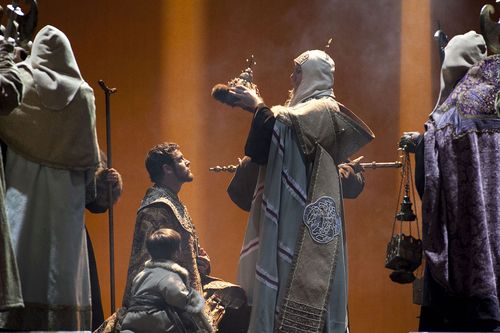 Dans sa mise en scène assez conventionnelle, Andreï Kontchalovski favorise un découpage cinématographique des scènes avec de fréquents tombé de rideau qui ont la fâcheuse tendance à ralentir l'action. Puis à chaque lever de rideau, la scène, vide d'accessoires, s'emplit de la masse des chœurs. Malheureusement, sur ce décor de planches inclinées, ces entrées sont bruyantes au point de couvrir la musique de la fosse. Des chœurs qui, malgré les tentatives de Gianandrea Noseda de les dynamiser, manquent souvent de l'articulation musicale et de l'énergie vocale qu'on attend de cet acteur prépondérant de l'intrigue.