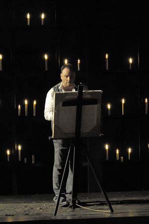 Vocalement l'œuvre est en grande partie portée par le rôle de Mathis incarné ce soir par le baryton Matthias Goerne, dont la voix toute en nuance lui permettait d'exprimer les tourments du personnage qui ne le lâcheront jamais du début à la fin de l'œuvre. Sa voix n'est toutefois pas la plus puissante qui soit et le grand volume de Bastille le met en difficultés ici ou là, et, avouons le, on le perd parfois. Surtout si la mise en scène en rajoute une petite couche, le faisant chanter au bord et en direction de la fosse d'où le son ne risque pas de ressortir, ou, à la fin du sixième tableau, dans son Alléluia, caché derrière la toile posée sur son chevalet qui fait alors office de filtre étouffant. Les lois de la physique sont têtues, les mises en scènes l'oublient parfois sans évidente contrepartie. Ces camarades masculins avaient moins de peine à projeter leur voix vers le public, en particulier l'impressionnant Cardinal de Scott Mac Allister. Melanie Diener enchanta le public par la variété de son jeu et la qualité de la voix dans le rôle d'Ursula, tour à tour tendre, forte et décidée, soumise, digne, alors que la plus frêle Martina Welschenbach semblait idéale dans la fragile Regina. Il faudrait les citer tous, ils étaient pourtant douze mais aucun ne fut en dessous du niveau d'excellence. Christoph Eschenbach dirigea tout son monde avec une baguette précise, attentive et manifestement passionnée par cette œuvre. C'est ce qu'il fallait pour faire tenir l'ouvrage. Nous ne formulerons que deux petits regrets : les cordes trop discrètes par rapport aux cuivres et percussions (encore les lois de la physiques ! ces instruments placés au bord du mur de fosse ne projettent aucun son direct vers la salle contrairement aux instruments placés vers le fond de la fosse) et une animation interne qui aurait pu être plus intense (la discrétion des cordes y prenant sa part).