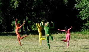 Le corps presque nu, torse peint de couleurs vives et paupières irisées, le duo de chorégraphes place le curseur de leur nouvelle création dans une atmosphère très 70. L'ambiance est romantique et lascive, piano blanc, sofa, gros projecteur, mousselines de couleurs. C'est pourtant au début des années folles que François Malkovsky a chorégraphié ces danses libres, dans le sillage d'Isadora Duncan. Les danses libres, marquées par un mouvement ondulatoire qui part du plexus solaire et parcourt toute la colonne vertébrale, émanent d'un courant artistique né au début du XXème siècle, précurseur de la danse moderne. Au sein de l'école de Paris, François Malkosvky a chorégraphié de courtes pièces, en solo ou en duo le plus souvent, destinées à être dansées pieds nus, sans entraves, en tuniques légères. Ces danses, on en convient, ne sont absolument pas viriles, et pourraient paraître terriblement mièvres si elles n'étaient pas habitées par des interprètes très inspirés. Même s'ils en rient parfois, comme dans l'une des danses intitulée « Les trois grâces », le ridicule ne tue pas, bien au contraire !