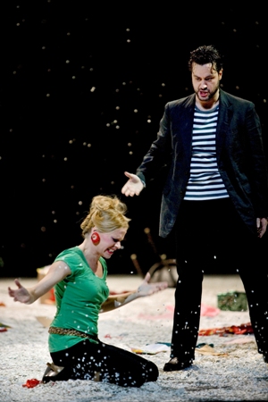 Mais attention, pas une Bohème classique, mais une relecture par Andreas Homoki en provenance du Komisch Oper de Berlin ! Donc, adieux mansardes crasseuses et artistes maudits ! Le public découvre une clique de bourgeois bohèmes branchés. Dès les premières mesures, le public se retrouve dans un vernissage mondain, avec un Marcello reconvertit dans «l'Action painting» ! Ce n'est pas foncièrement faux, mais la vision peine à s'imposer au fil de l'œuvre et atteint même l'impossible au dernier tableau ! En effet, nos jeunes artistes sont désormais célèbres avec un Rodolfo devenu un auteur à succès ! Tout ce petit monde s'épanche et s'enivre lors d'une fête destinée à arroser leurs gloires nouvelles ! La scène où Colline vend son manteaux (tandis qu'une quête est organisée auprès des invités de la fête) en devient presque risible car complètement incohérente en terme de dramaturgie. Un autre point assez pénible de cette lecture réside dans une vision unilatéralement machiste et sexiste de l'œuvre avec des hommes puissants et virils (une sacrée bande de queutards qui emballe tout ce qui passe) et des femmes soit Cendrillon naïve pour Mimí ou mégère hystérique et vulgaire pour Musetta quelque part entre Loana de Loft Story ou la Zahia de Franck Ribery…Homoki semble par ailleurs bien plus intéressé par des scènes d'ensembles, plutôt virtuoses, que par des scènes intimes où les chanteurs apparaissent un peu perdus et livres à eux-même.