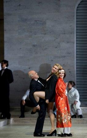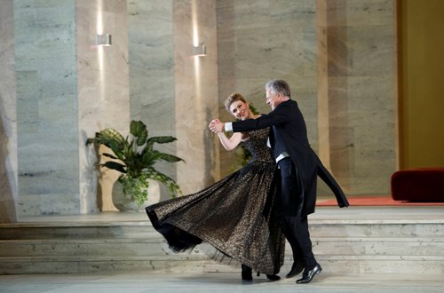 Si d'une manière générale, la mise en scène de Christoph Loy ne manque pas d'idées, il peine à aller au bout de celles-ci. La sauce ne prend pas toujours et, bien souvent, le soufflé retombe. Plus à l'aise dans la direction d'acteurs que dans les mouvements des masses, il nous emmène cependant dans quelques scènes magnifiquement réussies et pleines d'authenticité, comme celle qui réunit, au début du second acte, le Prince Danilo et Hanna Glawani dans une superbe interprétation du fameux Heure exquise, qui me grise… où les deux protagonistes sont dans un dialogue amoureux admirablement retenu et émouvant. Des instants de beau théâtre qui semblent avoir allumé la scène qui, jusqu'à la fin du spectacle, retrouve une vie qu'on avait pas ressenti jusque-là.