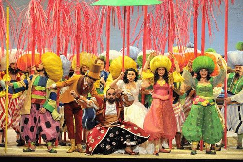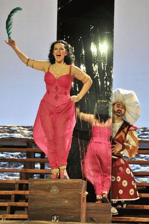 Mais L'Italiana in Algieri est plus dans l'absurde, le comique buffa, la raillerie. L'orient de pacotille n'a rien de féérique et le ton général de ce dramma giocoso se tourne vers la commedia dell'arte. La mise en scène est sage, s'égayent parfois de gags maintes fois vus (le couronnement de Taddeo en Kaïkaman tourné en parodie du Grand Mamamouchi du Bourgeois gentilhomme, les gestes automatiques en avant-scène lors du finale du premier acte, …) ou de références qui ne sont pas du meilleur goût (les eunuques en folles efféminées). De bonnes idées toutefois, telles ces trois agents spéciaux muets, sortes de Matrix au féminin avec turban noir surdimensionné, ou le tigre de Mustafà, vêtu d'un costume jaune vif, mais qui ne sont pas assez développées.