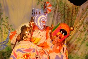 Les moyens de la compagnie, spécialiste des spectacles pour le jeune public, sont pourtant modestes (costumes et décors peints à la main, troupe constituée de seulement deux chanteurs). Mais les masques et les marionnettes permettent de composer autour des deux personnages principaux une galerie d’archétypes, croqués à plusieurs âges clés : le jaloux, le bon gros sympathique, le grand frère… D’autres accessoires, comme des balles ou des bâtons fluorescents, donnent l’occasion de séquences plus toniques en lumière noire. Et le spectacle emporte l’adhésion des enfants grâce à l’implication totale de ses interprètes.