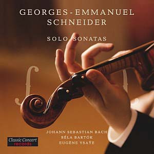 Johann Sebastian Bach (1685-1750) : Sonate pour violon seul n°2 en la mineur BWV 1003. Béla Bartók (1881-1945) : Sonate pour violon seul Sz. 117. Eugène Ysaÿe (1858-1931) : Sonate pour violon seul « à Fritz Kreisler » op. 27 n°4. Georges-Emmanuel Schneider, violon. 1 CD Classic Concert Records CCR62072. Code barre : 9120017620723. Enregistré en juillet 2010 au couvent de Höglwörth, Bavière. DDD. Notices trilingues (anglais, allemand, français) de Georges-Emmanuel Schneider. Durée : 62’37.