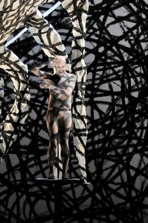 Du côté scénique, c'est au même Stanislas Nordey que revient la tâche délicate de «représenter l'irreprésentable» (Kafka, on le sait, ne voulait pas que l'on montre Gregor), un défi que le metteur en scène relève avec brio et – osons le mot au sein d'une telle monstruosité – une certaine élégance. L'homme-insecte – silhouette ondoyante de amarré sur un poteau – qui se fond à une araignée géante (et non un cancrelat) et semble tisser sa toile jusque sur les murs, est placé au centre de la scène, dans une position haute et immuable jusqu'à ce que l'on face «crever la bête» au sol. Mais à la faveur d'un habile jeu de voile et de lumière, cette vision ne nous sera révélée que progressivement, alors que le fond de scène se métamorphosera lui aussi au fil de la dramaturgie.