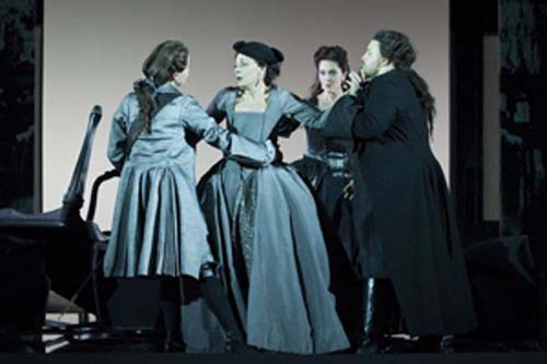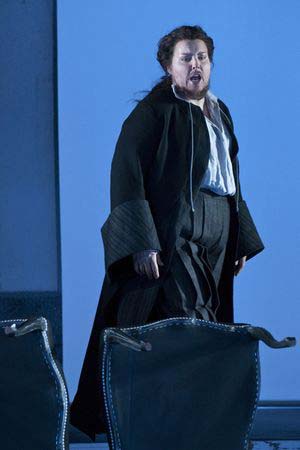 Chaque personnage dispose moins de sa nature propre qu'il n'est un espace vacant où chacune de ces dialectiques sèmera la tempête, voire la guerre. Comme bien souvent, Pierre Audi est un lecteur impeccable : ses personnages errent, fantomatiques, dans une Venise en noir et blanc, où ils sont les marionnettes d'une trouble cérémonie funèbre qui les dépasse. La scénographie consiste en une boîte qui, posée sur un sol en faux-marbre miroitant, occupe tout le plateau ; du devant à l'arrière de scène, cinq champs (quasi-cinématographiques) de profondeur – leurs panneaux se lèvent vers les cintres ou se fendent en leur milieu – sont couverts par des photographies agrandies de scènes vénitiennes. Hiératique, ce dispositif rappelle celui, admirable, que, au début des années 1980, au Théâtre de l'Odéon, Giorgio Strehler avait conçu pour L'illusion comique de Corneille. Et ce palais de mort, si finement éclairé, est hanté par des personnages presque tout de noir vêtus. (Habilement, dans les arie ABA, ces silhouettes prennent en charge la mobilité et dispensent le metteur en scène, pour varier l'atmosphère, de faire gratuitement bouger le chanteur soliste. ) Troublant mais passionnant, à la mesure de l'ambition que porte ce grand livret. La direction d'acteurs, efficace et expressive, répond aux enjeux de ce matériau littéraire, sauf à l'acte III où Pierre Audi reprend les lieux communs (corps penchés et oscillants, visages grimaçants) qui désignent la folie.