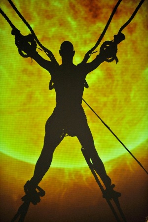Est-ce le cauchemar d'un pompier pyromane ? Rien ne manque à la mise en scène incendiaire de Jan Fabre, qui explore la thématique du feu jusqu'à la cendre : seaux rouges de pompiers, extincteurs géants, sorties de secours… Autour d'un Prométhée encordé dans le vide, au centre de la scène, comme crucifié, les danseurs et les comédiens de Troubleyn déroulent la lance à incendie avec forces fumigènes et jets de sable dans une mise en scène qui pourrait aisément être transposée pour le Ring.