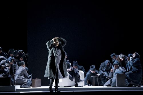 Un opéra autour de la poétesse Anna Akhmatova vient de Christophe Ghristi, actuel dramaturge à la «Grande boutique», après l'avoir été, aux côtés de Nicolas Jœl, au Théâtre du Capitole. La nature de ce livret – une façon de «biopic» cinématographique – étonne : tout au long de la représentation, l'opéra hésite entre peinture d'histoire (avec de multiples personnages dont le poids dramaturgique doit équivaloir, comme dans Boris Godounov) et portrait (telle Violetta dans La Traviata, le rôle-titre monopolise l'attention dramaturgique et relègue les autres personnages à des seconds plans sporadiques), entre récit tragico-historique et subjective écriture de l'intime. Au cours de la période historique choisie – vingt années au cours du stalinisme et du post-stalinisme –, l'éminente poétesse nous apparaît comme un écran sur lequel se projettent, non ses pensées et pulsions, mais ses êtres proches et les circonstances historiques qui l'environnent. Minuscule et éperdue au milieu d'un intelligent dispositif scénographique (il sera décrit ci-après), Anna Akhmatova apparaît, pendant deux bonnes heures, comme une figure vidée qui, malgré l'ardeur de son interprète, erre sur le plateau et peine à captiver, à émouvoir. En outre, la matière littéraire de ce livret accumule, sans les renouveler, lieux communs et objets trouvés, tels l'habitat communautaire, la grégarité du peuple et des prisonniers, les restrictions alimentaires et l'expression, orale et écrite, cryptée afin d'éviter la prison. Sans doute à son insu, le librettiste a oublié qu'un personnage (vivant ou fictif) est un abîme de complexité ; vingt ans après la chute du Mur de Berlin, il est surprenant que les vies individuelles en des temps dictatoriaux soient énoncées en des termes et situations aussi peu nuancés. Enfin, ajoutons que le rythme dramaturgique global emprunte plus à un traditionnel film télévisuel qu'à un acte théâtral d'aujourd'hui.