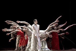 Bruxelles. Théâtre Royal de La Monnaie. 10-V-2011. Toshio Hosokawa (né en 1955) : Matsukaze, opéra en cinq scènes. Création chorégraphique et mise en scène : Sasha Waltz, décors : Pia Maier Schriever /Chiharu Shiota, costumes : Christine Birkle, lumières : Martin Hauk. Avec : Barbara Hannigan, Matsukaze ; Charlotte Hellekant, Murasame ; Frode Olsen, Mönch ; Kai-Uwe Fahnert, Fischer. Compagnie Sasha Waltz&Guests ; Vocalconsort Berlin et orchestre de chambre de La Monnaie, direction : Pablo Heras-Casado