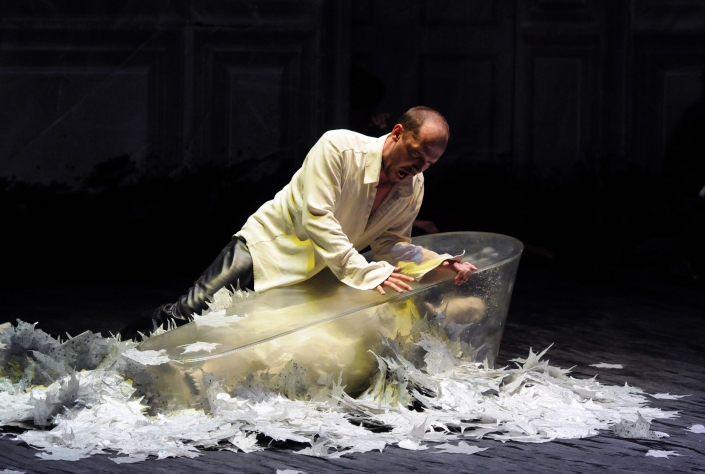 Le principal mérite de Vincent Boussard est donc d'avoir judicieusement évacué toute l'imagerie imposée par la tradition pour resserrer le drame autour de ses quatre principaux protagonistes. Décor unique (Vincent Lemaire) de hautes parois d'une pièce du palais d'Elseneur, rongées à leur base par la pourriture du crime et comme froissées par les lézardes des âmes, costumes (Katia Duflot) riches et seyants de mode XIXème siècle, éclairages crus et cliniques (Guido Levi) variant pertinemment les ambiances. Les rares accessoires sont tous révélateurs ; Hamlet se confronte dès la première scène à un portrait, prêt déjà à être remisé, du roi son père assassiné, un grand miroir dénonce par son reflet le meurtrier Claudius et Ophélie se noie dans sa baignoire, après avoir froissé en fleurs les pages des livres qu'elle aime tant, scène d'une extraordinaire force dans son dénuement, son évidence et le caractère finalement si bourgeois de cette tragédie. Une direction d'acteurs au cordeau vient parachever la réussite, insiste sur la sensualité torride qui unit Claudius et la reine Gertrude et ménage des scènes d'une grande intensité dramatique telles que l'apparition du spectre du roi défunt descendant des cintres en marchant sur les murs ou comme la confrontation d'une violence terrifiante entre Hamlet et sa mère Gertrude, où il finit par déchirer sa robe en révélant ses dessous dignes d'une Messaline. Quant au chœur (impressionnante prestation en impact et plénitude sonore de celui de l'Opéra du Rhin), il est traité comme un observateur, à la manière antique.