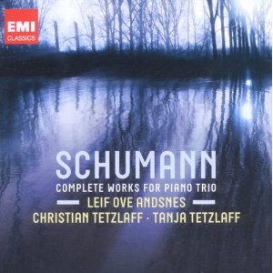 Robert Schumann (1810-1856) : Trios à clavier n°1-3, 6 études canoniques, Fantaisiestücke op.88. Leif Ove Andsnes (piano), Christian Tetzlaff (violon), Tanja Tetzlaff (violoncelle). 2 CD EMI. Référence 5099909418028. Code barre : 509990941802. Enregistré à l’Ostre Fredrikstad Kirke, Fredrikstad, les 24-26 octobre 2009 et 15-18 mai 2010. Notice trilingue (anglais, allemand, français). 121’56’’