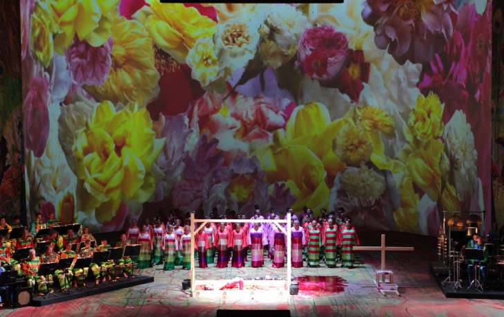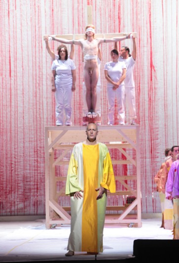Tantôt c'est le ballet des nombreux assistants en blanc qui versent du sang sur un jeune homme nu crucifié ou envoient des litres de peinture colorée au sol. Tantôt ce sont les vidéos envahissantes des deux premiers actes s'imposent au spectateur par leur vacuité entêtée, ainsi pendant la belle scène du sermon aux oiseaux, quand l'écran de projection semi-circulaire est envahi par une déferlante de photos d'oiseaux qui se superposent et agressent le spectateur qui hésite entre le mal de mer et le mal aux yeux. Tantôt Nitsch cesse d'être inspiré et laisse faire pendant de très longues minutes : à aucun moment il ne se préoccupe de diriger ses interprètes, qui se contentent donc de se placer en avant-scène et de débiter leurs rôles face au public, certains allant jusqu'à se balancer d'un air gêné d'un pied sur l'autre comme un amateur à son premier cours de théâtre. On n'oubliera pas de mentionner les costumes, sorte de défilé de mode pour secte solaire. On aimerait savoir ce qu'aurait pensé de cette mascarade compassée Thomas Bernhard, le grand contempteur de l'instrumentalisation par les élites de son pays d'un catholicisme réduit à son faste extérieur, celui des ornats baroques et des crucifixions sanguinolentes.