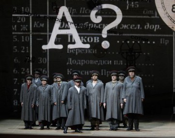 William Kentridge use et abuse de la largeur de l'espace scénique du Grand-Théâtre de Provence. C'est qu'il y a fort à faire dans Le Nez, les scènes, treize au total, s'enchainent rapidement, transportant l'histoire d'un bout à l'autre de Saint-Pétersbourg. Kentridge évite les traditionnelles cases (utilisées par Philippe Calvario dans Angels in America ou Dmitri Tcherniakov dans Wozzeck) pour un dispositif scénique coulissant, alternant les tableaux en avant-scène ou fond de scène. L'ensemble, conçu avec intelligence, est agrémenté de collages muraux géants très agit-prop post révolutionnaire, le tout recouvert de vidéos suggestives inspirées du théâtre d'ombres. Dans cet espace scénique chargé, les 68 rôles tenus par 25 chanteurs, auxquels s'ajoutent autant de choristes, dix comédiens et six figurants, se bousculent à qui mieux-mieux. Aucun geste n'est laissé au hasard, tout les déplacements de ce beau monde sont réglés au millimètre près, aucune place n'est laissée au hasard. Un grand travail de théâtre. On regrettera juste le hiatus entre la période suggérée (contemporaine de l'œuvre, 1930) avec les situations, lieux et personnages (dandy, nobles, cathédrale, …) typiques du XIXe.