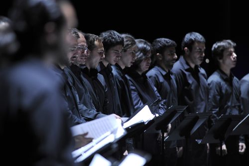 L'action peu à peu emporte l'adhésion d'un public venu en masse – l'immense Corum affichait complet – avec l'intervention trop courte de deux danseurs figurant Electre et Oreste. La spatialisation sonore – le chœur masculin entourant le public à l'orchestre en maniant divers sifflets et percussions – aide aussi à entrer au cœur de la tragédie et d'un rite sauvage et paganiste. En revanche Spyros Sakkas, figurant Athéna devant l'aréopage dans Les Euménides, est inaudible.