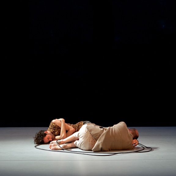 Seuls accessoires de ce duo insolite, des rallonges électriques noires empruntées aux techniciens du Théâtre de la Bastille. Une économie de moyens également reflétée par le dispositif scénographique qui propose de simples projections de photographies de forêts ou de baobab. Des images qui nous emmènent ailleurs…