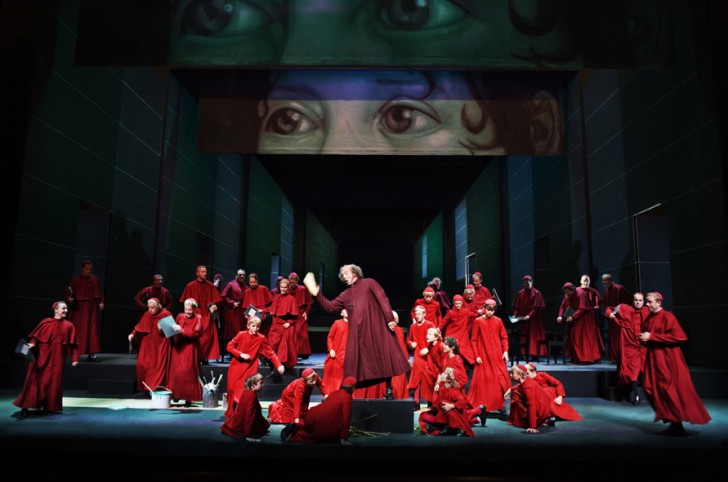 Un tel écrin à la pointe de la technologie, offre aux metteurs en scène l'occasion d'oublier les contraintes techniques propres aux salles plus anciennes. Cela n'a pas échappé à Peter Langdal qui signait ce spectacle. Avec la scénographe Katie Betz, il a imaginé un décor décuplant l'impression d'un point de fuite visuel se perdant au centre du plateau. En avançant vers l'arrière du plateau, l'espace se rétrécit comme si l'on regardait à l'intérieur d'une longue vue. Pour encore renforcer cette impression de vertige, le décor était découpé en « tranches » pouvant chacune se mouvoir en basculant de droite à gauche. A travers certaines scènes, cela permettait de créer des mouvements de torsion du plateau, capables de provoquer le mal de mer chez le plus fier des matelots. Ces mouvements constituaient la majorité de l'animation du plateau. Pour habiller cet espace, les parois latérales du décor étaient simplement striées de bandes lumineuses, conférant à chacun des tableaux une atmosphère distincte. A l'intérieur de cette « boite » nous avons vu évoluer les différents protagonistes dans des costumes classiques, et dans du mobilier de style empire (inévitable…). Nous pouvons saluer ici la bonne harmonie visuelle entre un plateau résolument moderne et des costumes à l'esthétique traditionnelle. Seules les lumières gâchaient par instant cette fête. On a également ressenti plusieurs fois en cours de spectacle une volonté de démontrer à tout prix les capacités techniques de la machinerie de scène, emportant finalement le spectateur dans un grand gadget mobile et lumineux sans réel apport scénographique.