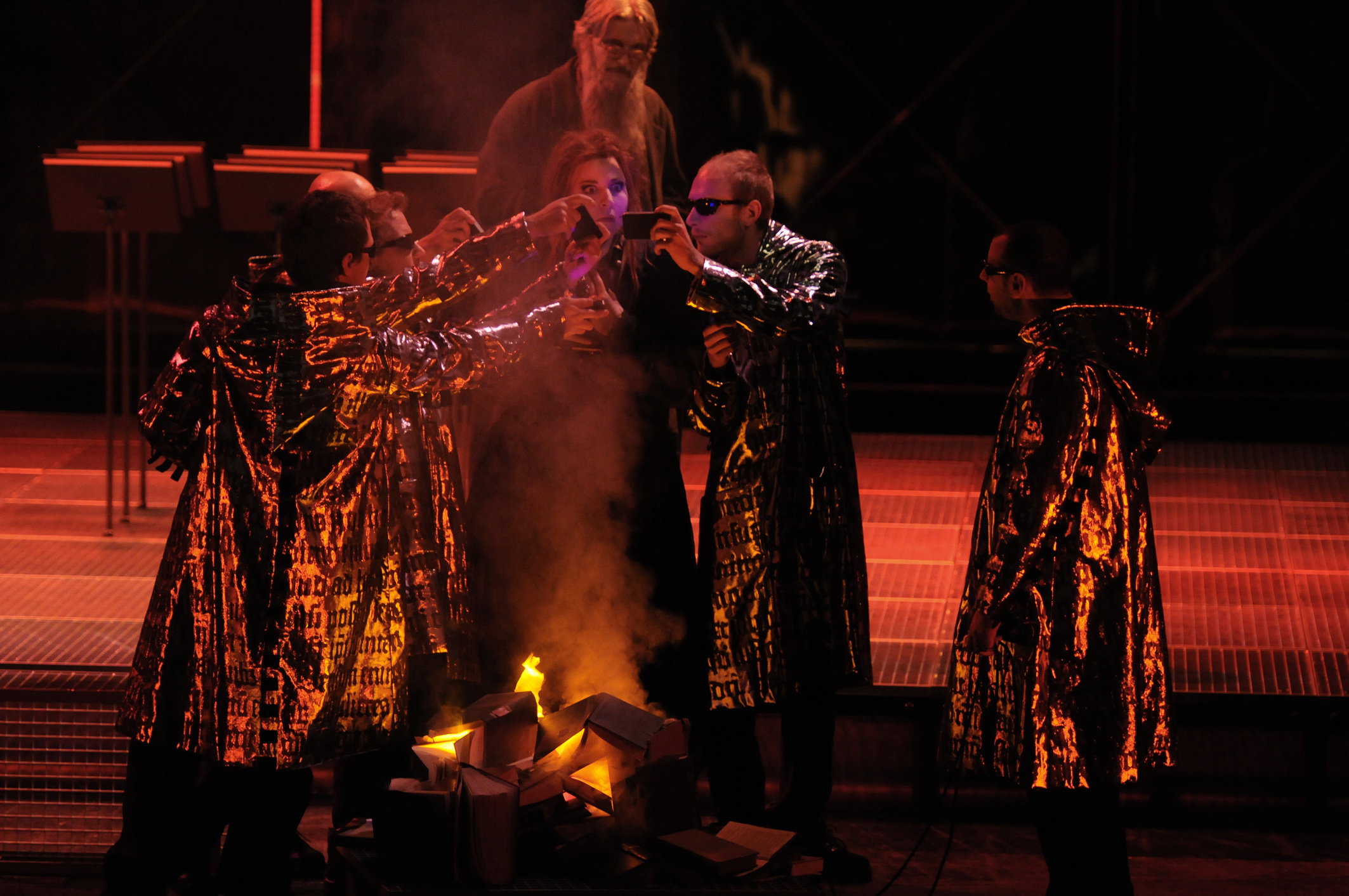 Honneur donc au génie local Gutemberg qui va en effet séjourner à Strasbourg de 1434 à 1444, présence attestée par des pièces judiciaires et des contrats signés de la main de cet inventeur visionnaire. Il retournera ensuite à Mayence, sa ville natale où il finira sa vie après avoir mis au point la technique de l'imprimerie. Pour autant, ce n'est pas le récit biographique d'une vie qui intéresse Manoury mais bien davantage le questionnement de l'écriture et ses implications, celle de la communication en particulier: « Au départ je n'avais qu'une seule image en tête: une tablette d'argile – celle des quatre Sumériens au début de l'opéra – qui se brise et se transforme en un immense réseau électronique de communications ». Si les personnages dûment déguisés du Prologue – référence au Moïse et Aaron de Schoenberg – reviennent à la fin, c'est pour dénoncer le fétichisme attaché à ces nouvelles machines à communiquer.