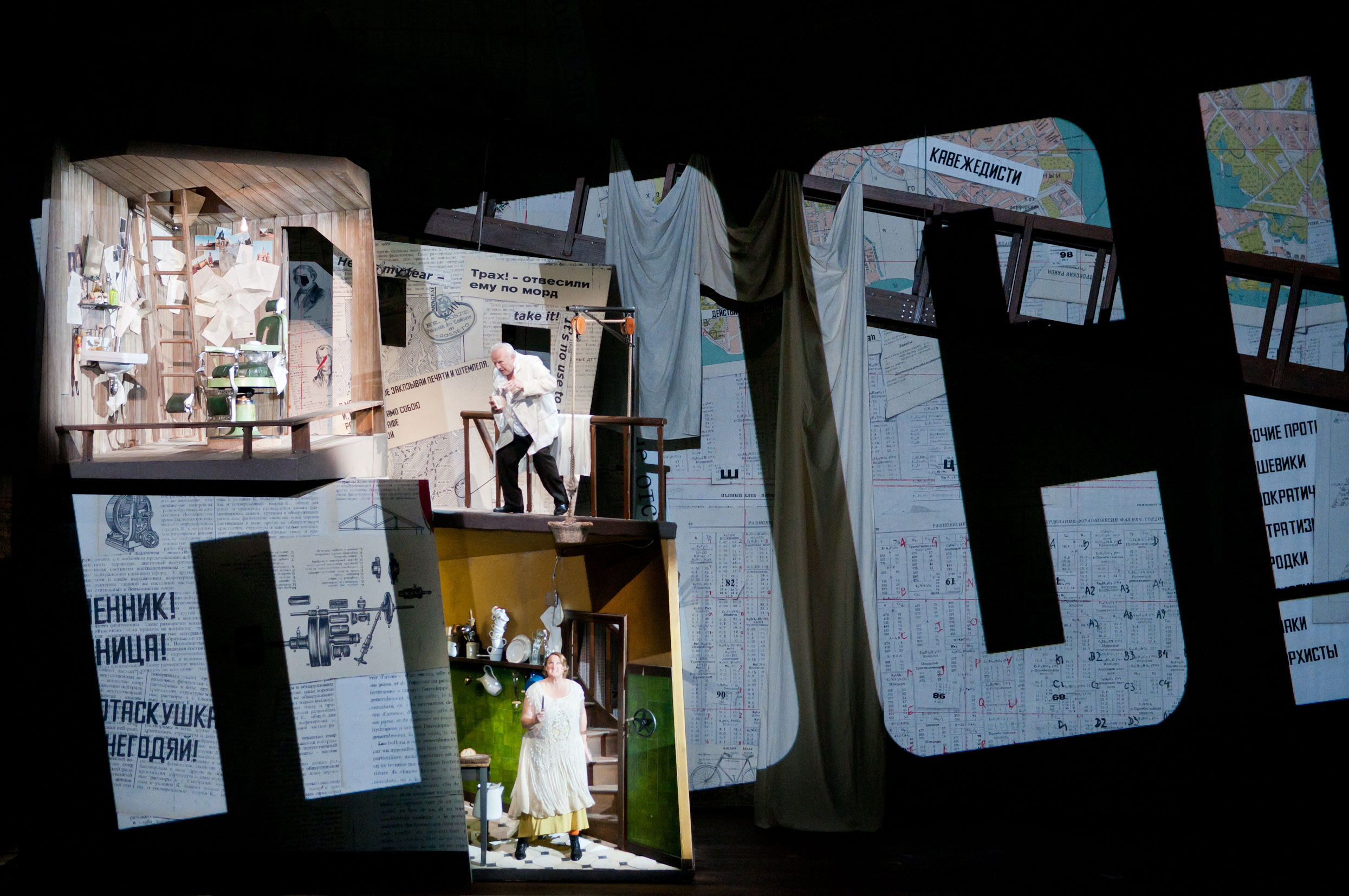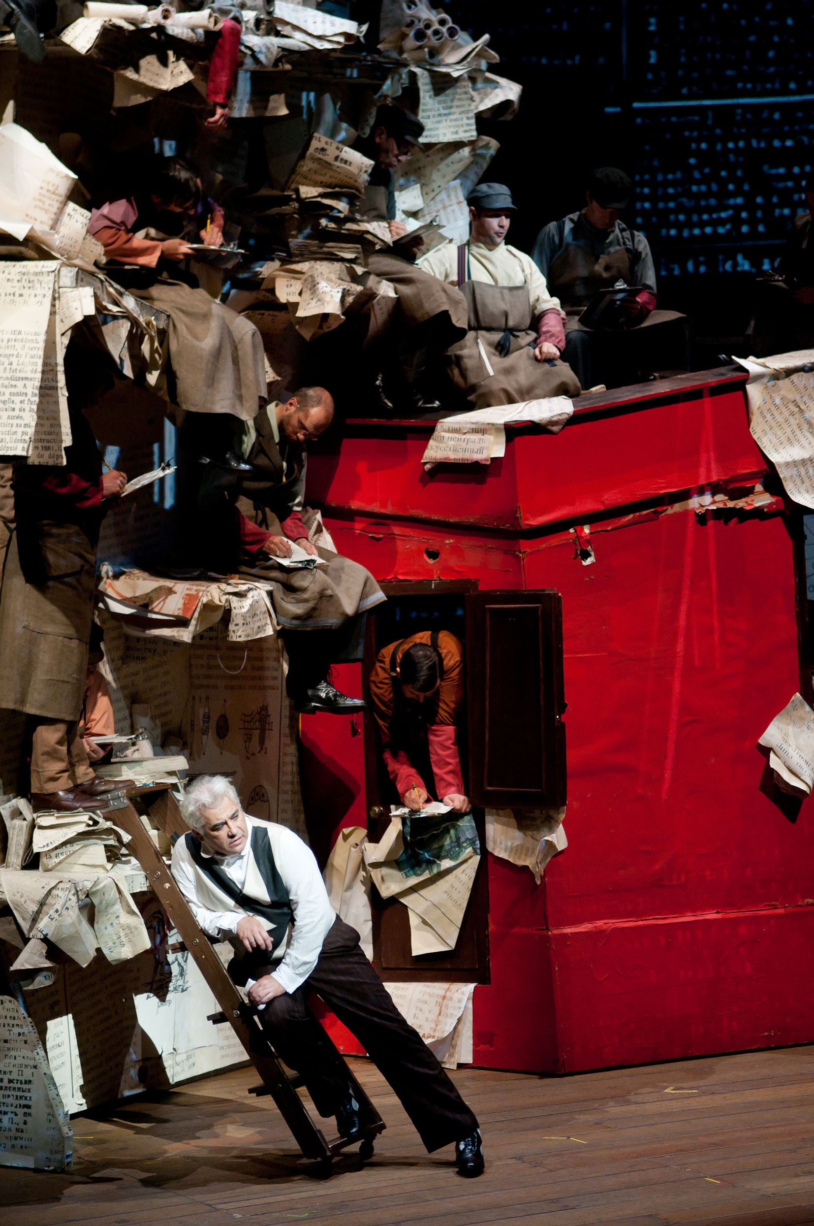 Lyon, Opéra. 11-X-2011. Dimitri Chostakovitch (1906-1975) Le Nez. Opéra en trois actes et dix tableaux sur des livrets de Evgueni Zamiatine, Georgi Jun’in, Alexander Prejs et Dmitri Chostakovitch tirés de la nouvelle éponyme de Nikolaï Gogol. Mise en scène, décors et vidéo : William Kentridge ; scénographie : Sabine Theunissen ; costumes : Greta Goiris ; lumières : Urs Schönenbaum. Avec : Vladimir Samsonov, Kovaliov ; Alexandre Kravets, le Nez / Yarijkine ; Andrey Popov, le sergent de quartier ; Vladimir Ognovenko, Ivan Yakovlévitch / Khozrev-Mirza ; Claudia Waite, Prasskovia Ossipovna / la Marchande de bretzels / une Dame respectable ; Vasily Efimov, Ivan / le Premier fils / Un Premier nouveau venu ; Yuri Kissin, le Fonctionnaire du journal / le Second fils / un opportuniste / Quelqu’un ; Gennady Bezzubenkov, le Docteur / Domestique 8 / Un Père / le Second nouveau venu ; Margarita Negrasova, Pélaguéia Grigorievna Podtotchina ; Tehmine Yeghiazaryan, sa Fille / une Mère ; Philip Horst, Domestique 3 / Policier 4 / Monsieur 4 / le Second fils de la Dame respectable / une Première connaissance de Kovaliov ; Sion Goronwy, un voiturier / Domestique 2 / Policier 1 / Monsieur 5 / le Premier fils de la Dame respectable ; Ruslan Rosyev, un factionnaire / Domestique 1 / Policier 10 / Monsieur 6 / Etudiant 3 ; Nika Guliashvili, un Laquais / Domestique 4 / Policier 3 / le Second dandy ; Felix Flores, Domestique 6 / Ivan Ivanovitch / Etudiant 8 ; Constantin Brzhinsky, le Valet d’une comtesse / Policier 6 / un Cocher / Etudiant 4 / la Troisième connaissance de Kovaliov ; Oleksiy Palchykov, Policier 2 / Monsieur 2 / le Premier dandy ; Dmitri Iogman, Policier 7 / Monsieur 3 / Etudiant 2 ; Maxim Sazhin, l’huissier du Commissariat / Policier 5 / Monsieur 1 / Etudiant 1 ; Vasily Gafner, Policier 8 / Monsieur 7 / Etudiant 5 / la Deuxième connaissance de Kovaliov ; Stuart Patterson, Policier 9 / le Petit vieux / Etudiant 6 ; Alexandra Guérinot, une vieille noble ; Paolo Stupenengo, Domestique 5 ; Jean-François Gay, Domestique 7 ; Marie-Eve Gouin, soprano solo. Chœur et Orchestre de l’Opéra national de Lyon (chef de chœur : Alan Woodbridge), direction musicale : Kazushi Ono.