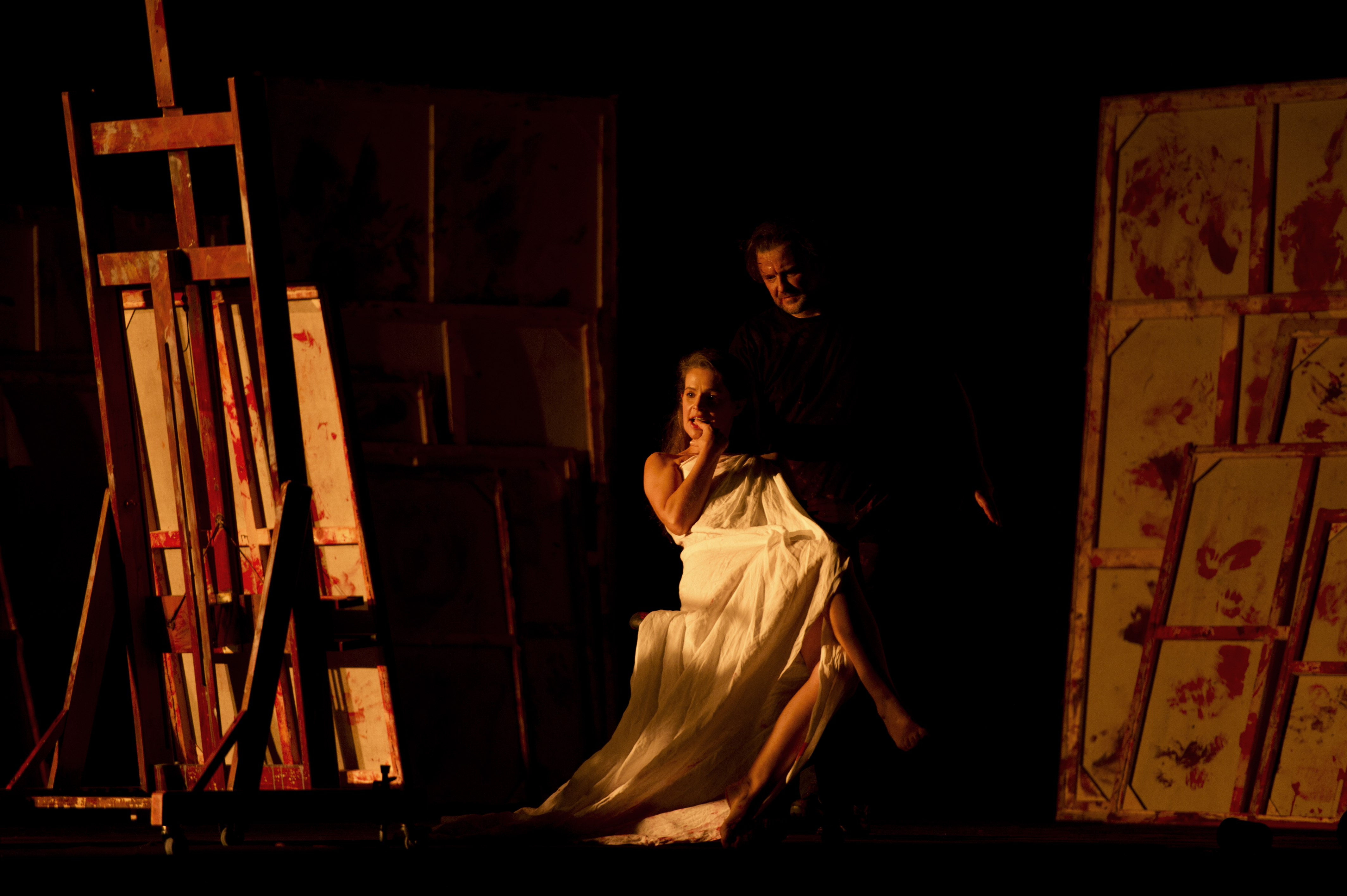 Si modernisa l'œuvre comme il se doit, il n'en dénatura aucun des concepts et sut parfaitement mettre en lumière les enjeux du drame wagnérien, donnant à chaque personnage un corps et un espace qui leur permirent de prendre complètement vie, leur imprimant juste ce qu'il faut de mouvements pour s'exprimer avec plénitude. Ainsi le héros n'est plus poète mais peintre, le concours de chant devient concours de toiles dans une galerie d'art, et la symbolique de la croix du péché ou de la rédemption est prise par le croisillon  du support des toiles peintes qu'on ne verra que de dos, laissant entier le mystère de leur recto. Cette vision, qui jamais ne vient percuter le texte de Wagner, fonctionne à merveille. Néanmoins on nous autorisera à trouver le premier acte un peu tristounet, tout de noir vêtu du sol au plafond, comme le sera Tannhäuser et ses acolytes mâles. Seul la peinture  rouge sang, symbole multiple, utilisée par l'artiste apporte un timide contraste, alors que la drap blanc de la couche de Vénus, tout autant symbolique, sera le seul rayon de lumière de toute cette première partie d'acte. Du coup, même si on ne reprochera pas au metteur en scène d'avoir zapper tout le décorum chargé voire tarabiscoté du Venusberg, avec ses diverses créatures mythologiques se livrant sans retenue aux plaisirs charnels, ce qui peut vite devenir lourdingue ou risible, on regrettera, qu'hormis une Venus en tenue d'Eve (non créditée au générique et dont la substitution avec à la fin de la scène est quasi imperceptible), il évacua toute sensualité, hédonisme ou érotisme, réduisant sa bacchanale à une trentaine de mâles à demie en transe se vautrant dans la peinture rouge alors que Vénus se prélasse sur sa couche. Du coup, il n'évite pas une certaine lourdeur symbolique et on ne voit plus bien ce qui peut retenir le héros dans ce fameux Venusberg, pourtant un des enjeux de l'œuvre. Mais c'est bien là le seul bémol que nous adresserons à cette scénographie intelligente, précise, vivante, et totalement respectueuse de l'esprit de l'œuvre. Contribuant, avec toutes les qualités réunies dans ce spectacle, à nous faire  recommander un passage par Bastille à tous les amoureux de Tannhäuser.
