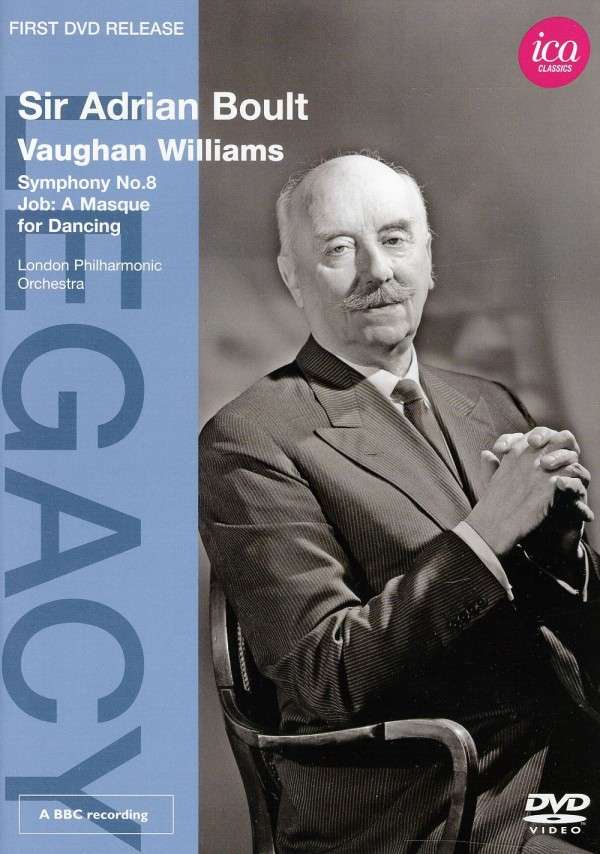 Ralph Vaughan-Williams (1872-1958) : Symphonie n°8 en ré mineur, Job : A masque for dancing. London Philharmonic Orchestra, direction : Sir Adrian Boult. 1 DVD ICA. Référence : ICAD 5037. Enregistré en octobre 1972. Notice de présentation en : allemande, anglais et français. Format image : 4:3. Format son non précisé. DVD toutes zones. Durée : 73’15