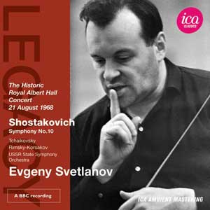 Dimitri Chostakovitch (1906-1975) : Symphonie n°10 en mi mineur, Op.93 ; Piotr Ilitch Tchaïkovski (1840-1893) : Melodrama extrait de la fille des neiges ; Nikolaï Rimski-Korsakov (1844-1908) : La légende de la ville invisible de Kitège (extraits). Orchestre symphonique d’Etat de l’URSS, direction : Evgeny Svetlanov. 1 CD ICA. Référence : ICAC 5036. Enregistré en 1968 à Londres. Notice de présentation en : anglais, allemand et français. Durée : 62’17
