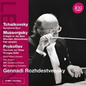 Piotr Ilitch Tchaïkovski (1840-1893) : Symphonie n°4 en fa mineur Op.36 ; Modest Moussorgsky (1839-1881) : Une nuit sur le Mont chauve ; Sergueï Prokofiev (1891-1953) : L’Amour des trois oranges, Suite Op.33 bis. David Wilson-Johnson, baryton ; BBC Singers, BBC Symphony Chorus et BBC Symphony Orchestra, direction : Guennadi Rojdestvensky. 1 CD ICA Référence : ICAC 5035. Enregistré entre 1979 et 1981. Notice de présentation en : anglais, allemande et français. Durée : 68’34