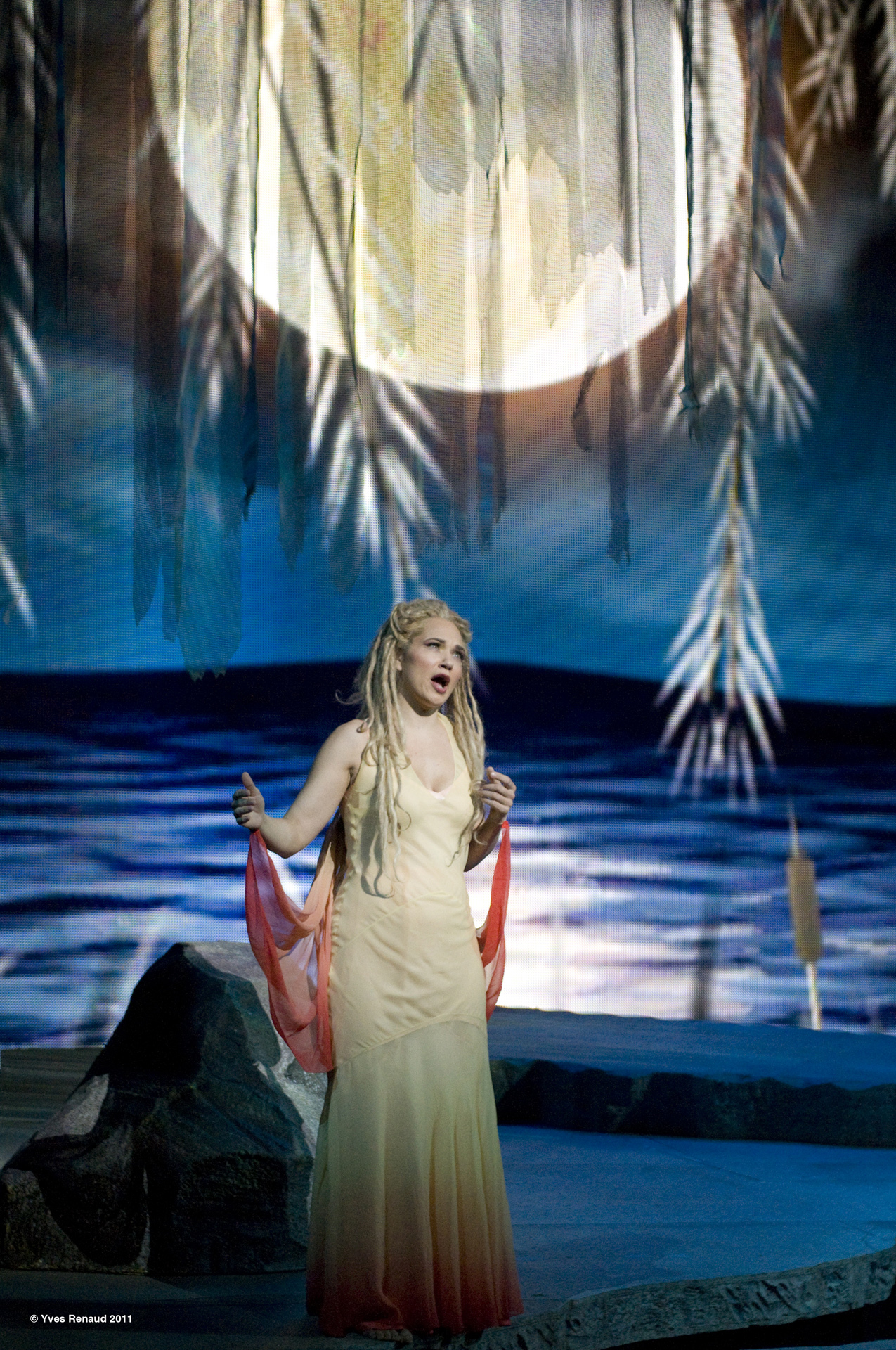 Opéra de Montréal. Salle Wilfrid-Pelletier de la Place des Arts. 12-XI-11. Antonín Dvořák (1841-1904) Rusalka, conte lyrique en 3 actes sur un livret de Jaroslav Kvapil (d’après Undine de Friedrich de la Motte-Fouqué et La petite sirène d’Andersen). Mise en scène : Eric Simonson, remonté par Bill Murray. Décors : Erhard Rom. Costumes : Karin Kopischke. Éclairages: Anne-Catherine Simard-Deraspe. Chorégraphies : Aimée Simard, Noëlle-Émilie Desbiens (d’après la chorégraphie originelle de Mathew Jancewski. Vidéos : Wendall K. Harrington. Vidéo Consultation et opération : Cinéphile Productions. Avec : Kelly Kaduce, Rusalka ; Khachatur Badalyan, Le Prince ; Robert Pomakov, Vodnik ; Liliana Nikiteanu, Jezibaba ; Ewa Biegas, La Princesse étrangère ; Pierre Rancourt, Le Chasseur ; Chantal Nurse, Première Nymphe ; Aidan Ferguson, Deuxième Nymphe ; Emma Parkinson, Troisième Nymphe. Chœur de l’Opéra de Montréal. Chef de chœur : Claude Webster. Pianiste-répétitrice : Esther Gonthier. Pianiste-répétitrice et réchauffement du chœur : Tina Chang. Coproduction : The Minnesota Opera & The Boston Lyric Opera. Orchestre Métropolitain. Direction : John Keenan