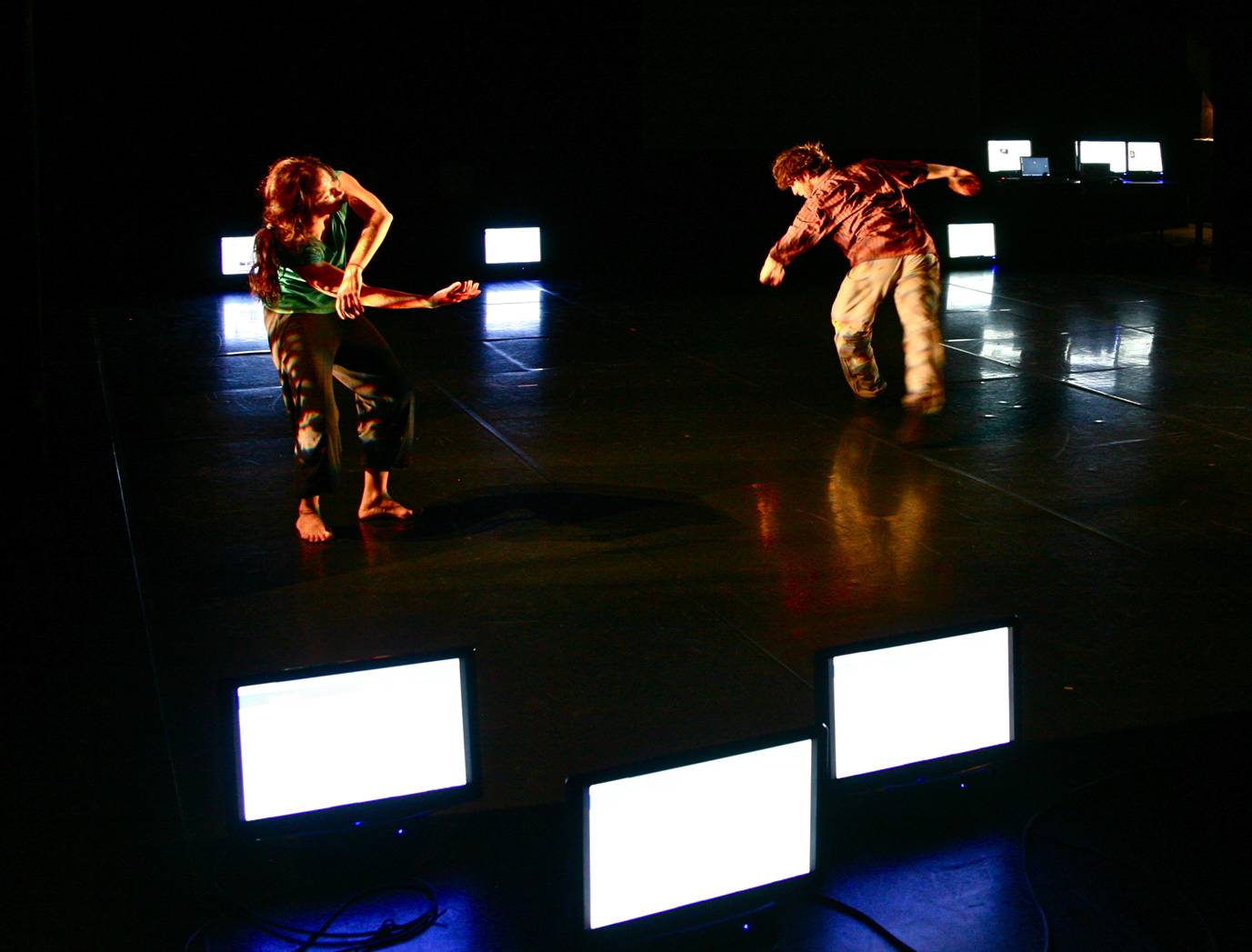Quelle est la place qu’occupe la vidéo ? Les images sont projetées sur grand écran en fond de scène et sur une dizaine de petits disséminés sur le plateau. Ces images sont un rappel de la réalité qui y semble parfois bien inutilement vulgaire et on est tenté de faire la même remarque qu’au paragraphe précédent : qu’apportent-elles à la danse, sont-elles un contre-chant aux attitudes, une complémentarité ? Tout cela n’est pas très clair. On perçoit tout de même que le thème du voyage y est présent au début et à la fin de la prestation ; il semble honnête d’encourager les deux danseurs qui ont donné le meilleur d’eux-mêmes au cours de cette équipée difficile d’accès.