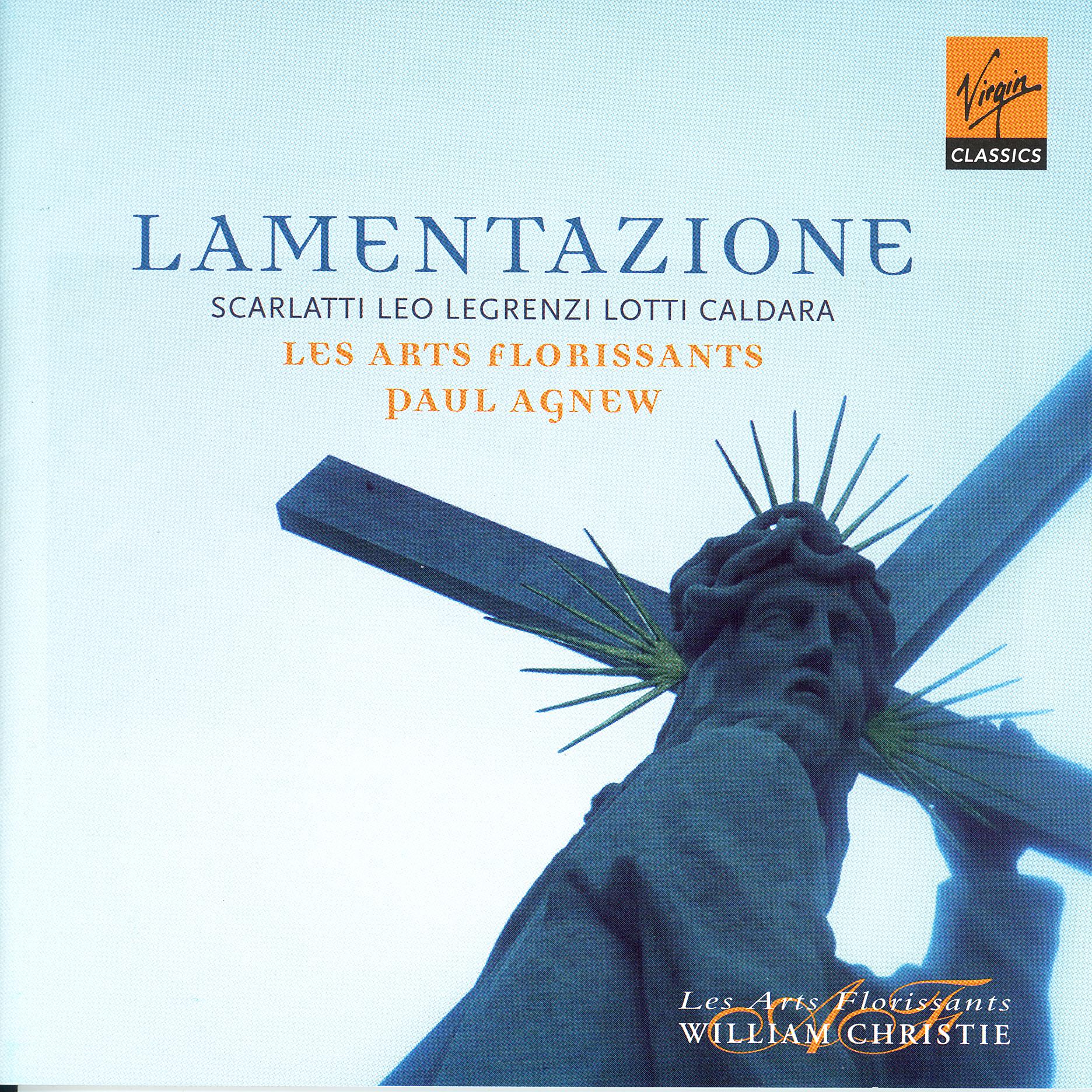 « Lamentazione » – Domenico Scarlatti (1685-1757) : Stabat Mater a 10. Antonio Lotti (1666-1740) : Crucifixus a 10, Crucifixus a 8. Giovanni Legrenzi (1626-1690) : Quam amarum est, Maria. Antonio Caldara (1670-1736) : Crucifixus a 16. Leonardo Leo (1694-1744) : Miserere a due cori. Les Arts Florissants, direction : Paul Agnew. 1 CD Virgin Classics 50999 0709072 1. Enregistré en live le 26 septembre 2010 en l’église abbatiale d’Ambronay. Notice trilingue excellente (anglais, français, allemand). Durée totale : 56’20’’