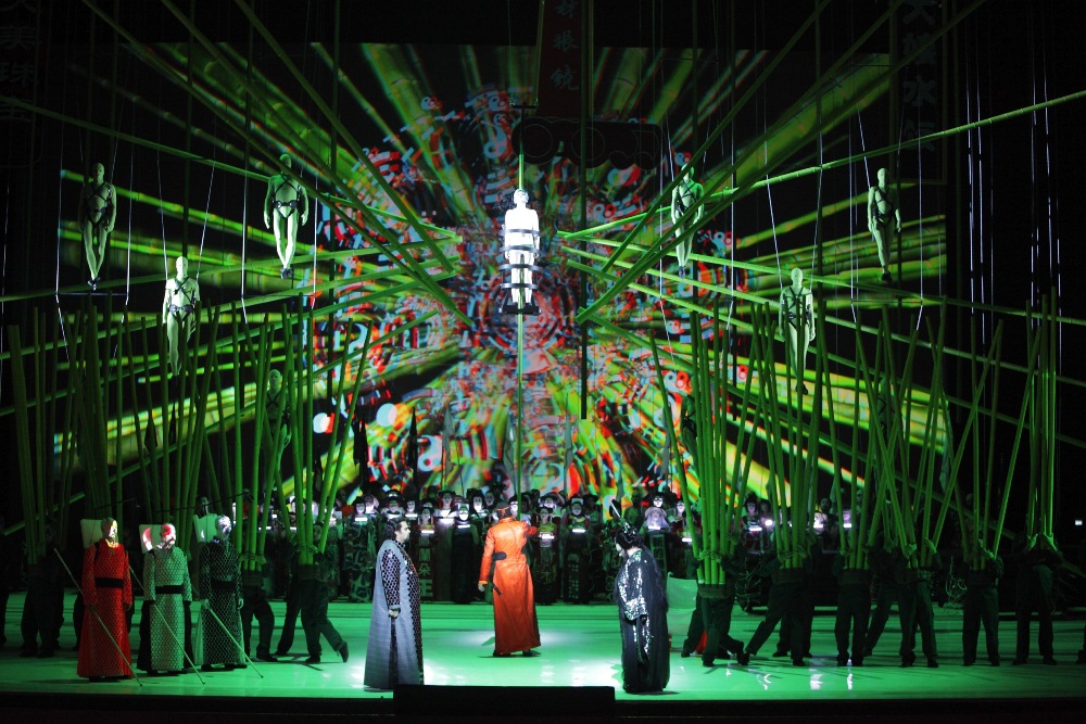 Padrissa sait parfaitement que, dans un tel contexte, il est de son devoir de se montrer critique envers le gouvernement chinois, ce qu'il fait du moins dans son texte du programme ; Turandot, assimilée à la dictature chinoise actuelle, est donc opposée à Liù, représentante d'une Chine éternelle douce et accueillante. Cela, sans doute, sonne comme un cliché – mais quelle réelle subversion, dans ces conditions, pouvait-on attendre ? Des clichés, il en pleut à verse pendant tout le spectacle, des idéogrammes aux costumes traditionnels en passant par les enseignes lumineuses de la mégalopole : il n'était pas besoin de se rendre sur les bords du Yang-tsé si c'était pour s'en tenir à ce que n'importe quel reportage télévisé sait synthétiser en dix minutes.