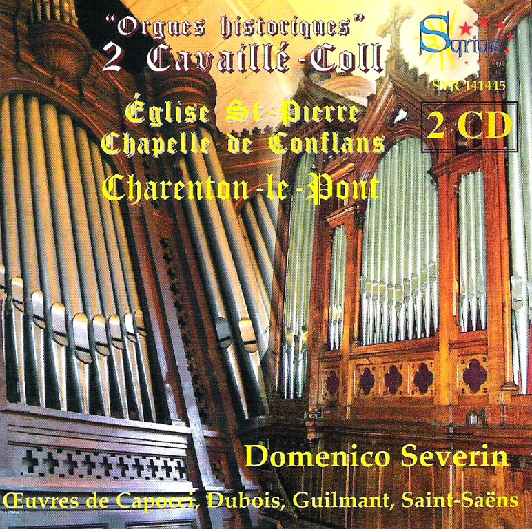 Théodore Dubois (1837-1924) : Prélude, Offertoire, In Paradisum, Prélude et fugue « à Filippo Capocci », Fiat lux. Camille Saint-Saëns (1835-1921): Fantaisie en ré bémol majeur op. 101, Allegro giocoso « à Eugène Gigout », Prélude et fugue en mi majeur, prélude et fugue en mi bémol majeur, prélude et fugue en si majeur. Filippo Capocci (1840-1911) : Solo di flauto , Solo di Oboe, Marcia, Melodia, Cappricio, Fantasia. Alexandre Guilmant (1837-1911): Andante con moto “à Aristide Cavaillé-Coll”, Scherzo, Elégie-fugue, Larghetto, Ecce panis angelorum, Marche aux flambeaux. Domenico Severin à l’orgue Cavaillé-Coll (1891) Adrien Maciet (1988) de l’église Saint-Pierre de Charenton-le-Pont et à l’orgue Cavaillé-Coll (1866) Mutin (1911) Yves Fossart (2008) de la chapelle de Conflans à Charenton-le-pont. 2 CDs Syrius SYR 141445. Code barre 3491421414458. Enregistré en mai 2011. Livret bilingue français/anglais. Durée totale : 121’30 »