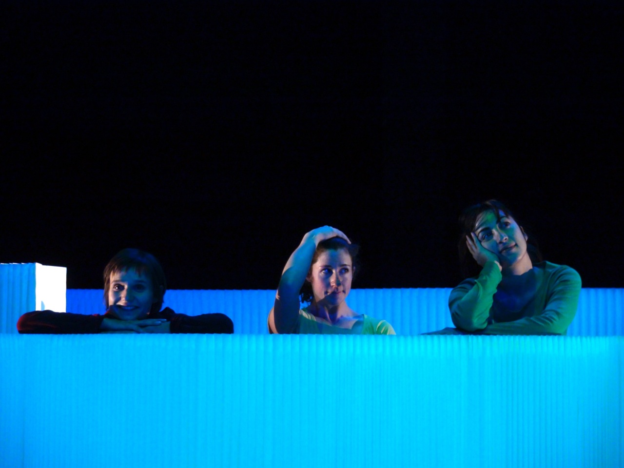 La véritable histoire des trois petits cochons est vite expédiée par la comédienne Marjorie Kellen : une simple infographie projetée sur un écran pliable. Cette comédienne incarne le loup, portant les mots de Marion Aubert, auteur du texte et complice de la chorégraphe.