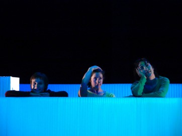 Paris. 27/XII/11. Théâtre national de Chaillot. Marion Lévy : Dans le ventre du loup. Chorégraphie : Marion Lévy. Texte : Marion Aubert. Assistante mise en scène : Nadine Marcovici. Scénographie et lumières : Julien Peissel. Vidéos : Collectif Scale. Son et coordination technique : Joachim Olaya. Collaboration musicale : Piers Faccini. Costumes : Hanna Sjödin. Conseiller dramaturgique : Daniel Loayza. Avec Aline Braz Da Silva, Séverine Bidaud, Flore Taguiev et Marjorie Kellen