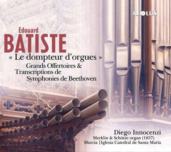 Edouard Batiste (1820-1876) : Offertoire en fa majeur op.10, Elévation en ut mineur op.5 n° 2, Offertoire en fa majeur op.36, Communion en sol majeur op.4, Offertoire-Fantaisie-Orage en ut mineur op.23, Elévation en la bémol majeur op.23, Offertoire en mi mineur op.27, Communion en mi majeur op.29, Offertoire en fa mineur op.28, Communion en la mineur op.28, Offertoire en la mineur op.38, Offertoire en mi bémol majeur op.40, Offertoire en mi bémol majeur op.36, Final de la symphonie n° 5 en ut mineur de Beethoven op.30, Communion (Andante de la symphonie n° 1 de Beethoven) en fa majeur op.31, Offertoire en si bémol majeur op.33 (Allegretto de la symphonie n° 8 de Beethoven), Offertoire funèbre (Adagio de la symphonie n° 3 de Beethoven ) en ut mineur op.31, Grand Offertoire (sur un thème de la sonate à Kreutzer de Beethoven) en fa majeur op.35, Offertoire (Larghetto de la Symphonie n° 7 de Beethoven) en la majeur op.31, Offertoire (Allegretto de la symphonie n° 7 de Beethoven) en la mineur op.33, Offertoire (Andante de la symphonie n° 6 de Beethoven) en si bémol majeur op.32, Elévation (Adagio de la Symphonie n° 4 de Beethoven) en mi bémol majeur op.32, Communion (Andante de la Symphonie n° 5 de Beethoven) en la bémol majeur op.32, Grande Sortie (Final de la symphonie n° 9 de Beethoven) en ré bémol majeur op.33, Offertoire en ré majeur op.39, Marche solennelle d’Hamlet (d’après Ambroise Thomas) en si bémol majeur. Diego Innocenzi à l’orgue Merklin et Schütze (1857) Daldosso (2008) de la cathédrale Sainte-Marie de Murcia (Espagne). 2 CDs Aeolus AE 10731. Code barre 4026798107314. Enregistré en février 2011. Livret de 36 pages trilingue français/anglais/allemand. Durée totale 2’40’’