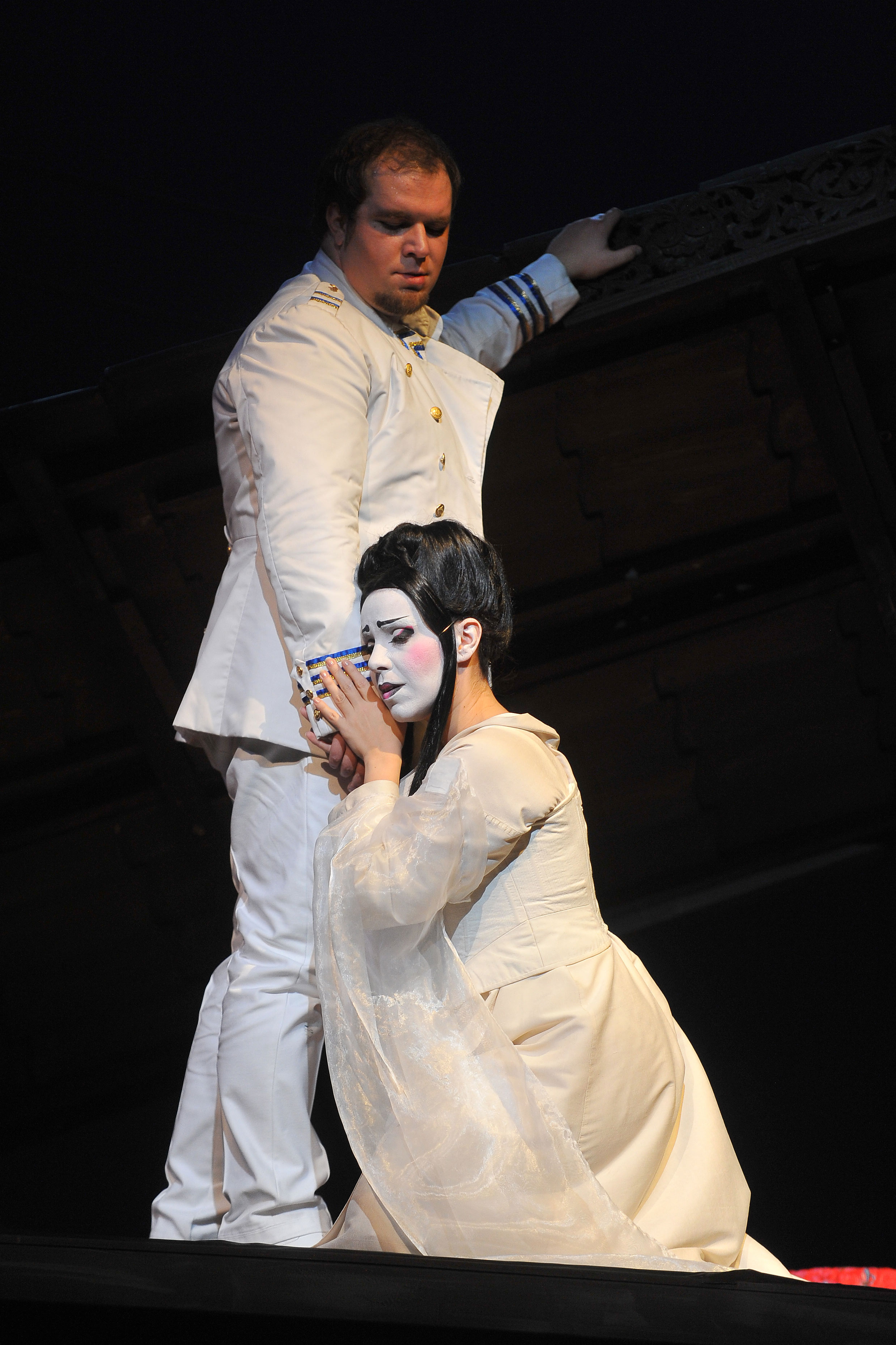 Fribourg. L’Equilibre. 26-I-2012. Giacomo Puccini (1858-1924) : Madama Butterfly, opéra en trois actes sur un livret de Giuseppe Giacosa et Luigi Illica. Mise en scène : Olivier Desbordes. Décors : Ruth Gross. Costumes : Olivier Desbordes et Patrice Gourdon. Lumières : Serge Simon. Avec : Sandra Lopez de Haro, Cio-Cio San ; Cristian Mogosan, B. F. Pinkerton ; Irina de Baghy, Suzuki ; Kristian Paul, Sharpless ; Jonathan Spicher, Yamadori ; René Perler, le Bonze ; Joelle Delley Zhao, Kate Pinkerton ; Eric Vignau, Goro ; Francis Benichou, Le Commissaire Impérial ; Vincent Lavantino, Yakusudè. Chœur de l’Opéra de Fribourg (chef de chant : Inna Petcheniouk) Orchestre de Chambre Fribourgeois, direction musicale : Laurent Gendre