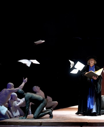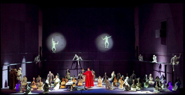Turin. 11-II-2012. Teatro Regio. Sergueï Prokofiev (1891-1953) : L’Ange de Feu, opéra en cinq actes et sept tableaux d’après le roman éponyme de Valéry Brjusov. Mise en scène : David Freeman. Décors et costumes : David Roger. Lumièrfes : Steve Wgitson & Vladimir Lukacevitch. Avec Evgeny Ulanov, Ruprecht ; Larisa Gogolevskya, Renata ; Vasily Gorskov, Agrippa di Nettensheim ; Evgueny Akimov, Mefistofele ; Grigory Karasev, Mathias Wissman, Un serviteur, Le troisième client ; Jury Alekseev, Jakob Glock, Le deuxième client ; Aleksander Morosov, Docteur Faust ; Alexey Tanovitsky, L’Inquisiteur ; Olga Savova, La cartomancienne, La mère supérieure ; Svetlana Volkova, La patrone du restaurant ; Vaceslav Luchanin, L’hôte ; Vladimir Zipopistchev, Un médecin ; Vasily Gorskov, Le premier client ; Tatiana Kravkova, La première novice ; Margarita Alaverdjan, La deuxième novice ; Nadejda Vasileva, Liudmila Kannunikova, Elena Karpesch, Aleksandra Kovaleva, Ekaterina Varfolomeeva & Svetlana Kiseleva, Les nonnes ; Valentin Krejsman, Le Comte Heinrich. Chœur et Orchestre du Teatro Regio de Turin (Chef du chœur : Claudio Fenoglio). Direction musicale : Valery Gergiev