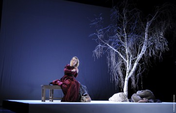 Et surtout, trois excellents acteurs, au service d'une mise en scène précise et originale, embellie de lumières et de costumes élégants. Yoshi Oida a longtemps joué pour Peter Brook (La Tempête, Le Mahābhārata) et a incarné l'éditeur du fascinant Pillow book de Peter Greenaway. Ses mises en scène d'opéra sont simples et belles, des qualités que l'on retrouve ici dans le dispositif et dans l'histoire qui est racontée. Le Joueur de vielle apporte à la Jeune femme un livre rouge sang, recueil des poèmes du Voyageur. Celle-ci, peut-être par la pensée, part sur ses traces dans un paysage enneigé, sans qu'ils puissent se rencontrer. Mais ce qui est vraiment poignant est la force de certaines scènes, construites autour du personnage du Joueur de vielle : il s'enivre de chagrin dans Auf dem Flusse, il entoure de sa sollicitude la Jeune femme exténuée dans Rast. Le passage de l'autre côté est d'une intensité si frappante, que l'on pardonne le dérangement dans l'ordre des lieder, qui n'était peut-être pas nécessaire. On aurait pu en revanche se passer dans les surtitres d'une fréquente erreur de traduction pour « wunderlich » (« étrange ») : le Joueur de vielle n'a rien de « merveilleux », pas plus que la corneille.