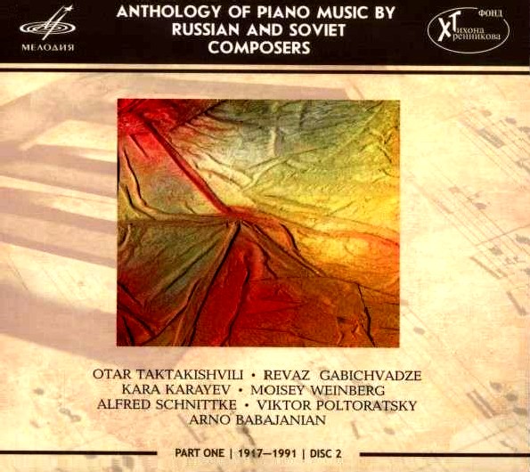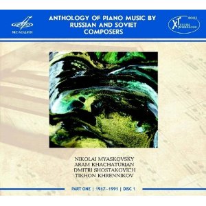 Anthologie de musique pour piano des compositeurs russes et soviétiques. Vol. I. Nikolaï Miaskovski (1881-1950) : Sonate n° 3 op. 19 en do mineur (seconde version, 1939) ; Aram Khatchatourian (1903-1978) : Toccata ; Dimitri Chostakovitch (1906-1975) : 24 Préludes, op. 34 ; Tikhon Khrennikov (1913-2007) : Cinq Pièces, op. 2 ; Trois Pièces, op. 5. Yuri Favorin ; Nikita Mndoyants ; Andrey Korobeynikov ; Tikhon Khrennikov, piano. 1 CD Melodiya. Réf. : MEL CD 10 01963, code barre : 4 600317 119639. Enregistrements : dates et lieux non précisés. Notice bilingue : anglais et russe. Durée : 64’49. Vol. 2. Otar Taktakishvili (1924-1989) : Poème pour piano ; Revaz Gabichvadze (1913-1999) : Souvenir et Scherzo, deux des Six Pièces pour piano ; Kara Karayev (1918-1982) : Six Préludes (extraits du livre II des 24 Préludes) ; Mieczyslaw Weinberg (1919-1996) : Sonate n° 5, op. 58 ; Alfred Schnittke (1934-1998) : Improvisation et Fugue ; Viktor Poltoratsky (1949-1985) : deux Préludes et deux Fugues issus des 24 Préludes et Fugues, op. 16 ; Arno Babajanian (1921-1983) : Six Images. Luka Okrostsvaridze ; Natalia Ruchkina ; Asiya Korepanova ; Mikhail Turpanov ; Nikita Mndoyants, piano. 1 CD Melodiya. Réf. : MEL CD 10 01964. Enregistrements : dates et lieux non précisés. Notice bilingue : anglais et russe. Durée : 67’24