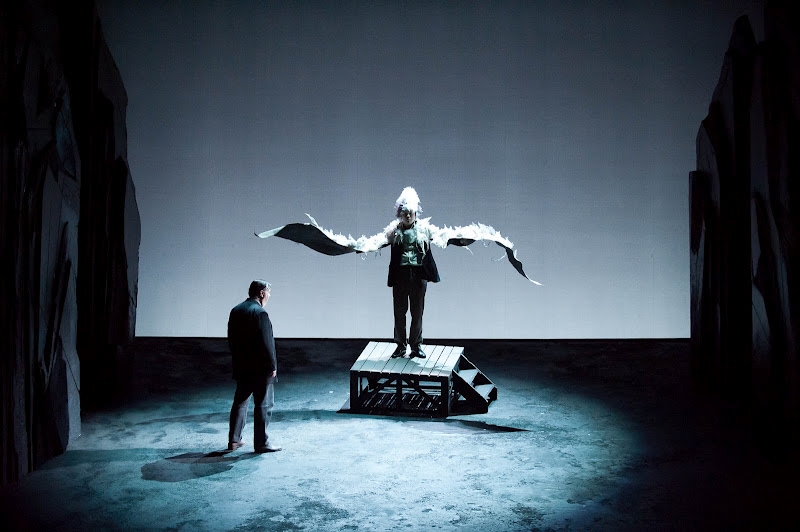Un concert monographique que, en septembre 2010, le festival Musica avait consacré à Oscar Bianchi, avait laissé une impression mitigée. Si l'articulation entre la forme et la durée n'était pas accomplie, la matière sonore avait frappé par la vie grouillante qui l'animait à chaque instant et par les profondeurs de champ sonore et dramaturgiques que les timbres creusent. Un socle précieux pour aborder un premier opéra. L'intrigue de Thanks to my eyes est simple : Aymar (contreténor) est le fils d'une femme âgée et désabusée(rôle parlé) et d'un père (baryton-basse) qui prétend, au terme d'une carrière internationale, être le plus grand artiste comique du monde. À son père qui veut lui transmettre son art, il oppose deux transgressions émancipatrices : il désire être un acteur sérieux et il éprouve une passion pour un femme timide (soprano aiguë) qu'il retrouve chaque nuit et avec laquelle il pourrait quitter le domicile parental. En sa structure comme en sa poétique, ce livret fait songer au théâtre irlandais au début du XXe siècle, notamment à William Bulter Yeats et à John Millington Synge.