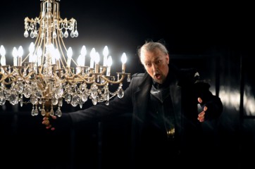 Le spectaculaire est présent dans le décor en transformation permanente de Pierre-André Weitz, vaste et imposante architecture de galeries à pilastres, de frontons triangulaires et de fenêtres à meneaux en texture de laiton. Il l'est aussi dans la mise en scène brillante d'Olivier Py qui manie les foules avec dextérité et utilise un banal escalier frontal avec une virtuosité confondante. Rien n'est laissé au hasard. Pour l'aspect historique (le livret se déroule sur fond de Massacre de la Saint-Barthélemy), les catholiques représentants de la tradition arborent des armures dorées et des fraises quand les protestants progressistes revêtent des redingotes de bourgeois de la Monarchie de Juillet et interviennent même Catherine de Médicis ou Henri IV. Pour faire sens, quelques idées fortes sont opportunément insérées comme ces croix qui deviennent épées, cette personnification de l'intolérance religieuse par un chevalier doré sans visage ou cette troupe des déportés apeurés avec leurs valises évoquant un autre massacre dû au fanatisme bien plus proche de nous. Mais que les fans d'Olivier Py se rassurent, ils retrouveront aussi les éléments familiers de son langage dans les suggestions homosexuelles de l'acte I ou les scènes de nu dans le parc de Chenonceau.