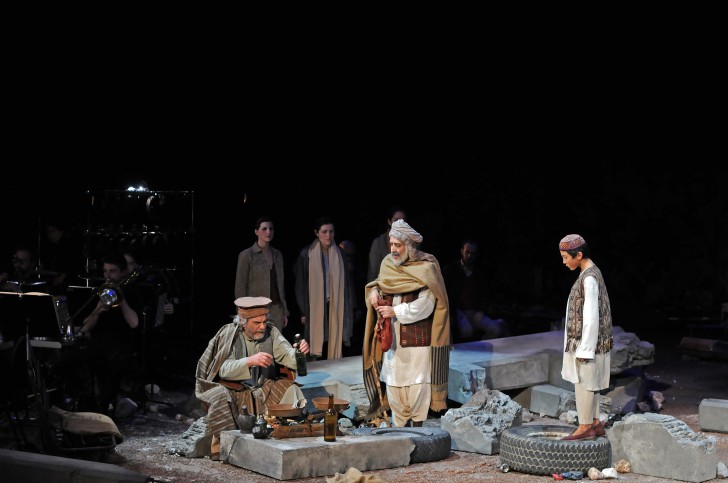 Terre et cendres est d'abord un roman d'Atiq Rahimi, publié en 2000. L'écrivain franco afghan en situe l'action en Afghanistan, pendant la guerre contre l'Union soviétique : un vieil homme annonce, à son fils, qui travaille à la mine, qu'un bombardement a tué beaucoup d'habitants de leur village, dont sa femme, et que, sous l'effet du souffle, son fils survivant est devenu sourd. En 2007, de son roman, Atiq Rahimi a tiré un beau film. Et, pour cet opéra, il a ramassé son propre roman et en a écrit le livret. Mais, loin d'égaler Joël Pommerat qui, pour Thanks to my eyes d'Oscar Bianchi, a su « élaguer l'arbre sans le couper », Atiq Rahimi a affadi son roman : son livret hésite entre pièce de théâtre, récit dialogué et conte (avec trois rôles parlés : deux narrateurs et un personnage accessoire). Puis, il se maintient entre le réel, menaçant et d'une violence désespérante, et une prise de distance symbolique. On notera toutefois la singulière fonction qui est assignée au chœur : non l'usage commentateur et oraculaire, telle que la tragédie antique grecque l'avait façonné, mais le partage du sort qu'éprouvent les protagonistes de l'intrigue. En dépit de ce dernier aspect, le lecteur-spectateur peine à trouver sa place et à être concerné, donc ému.