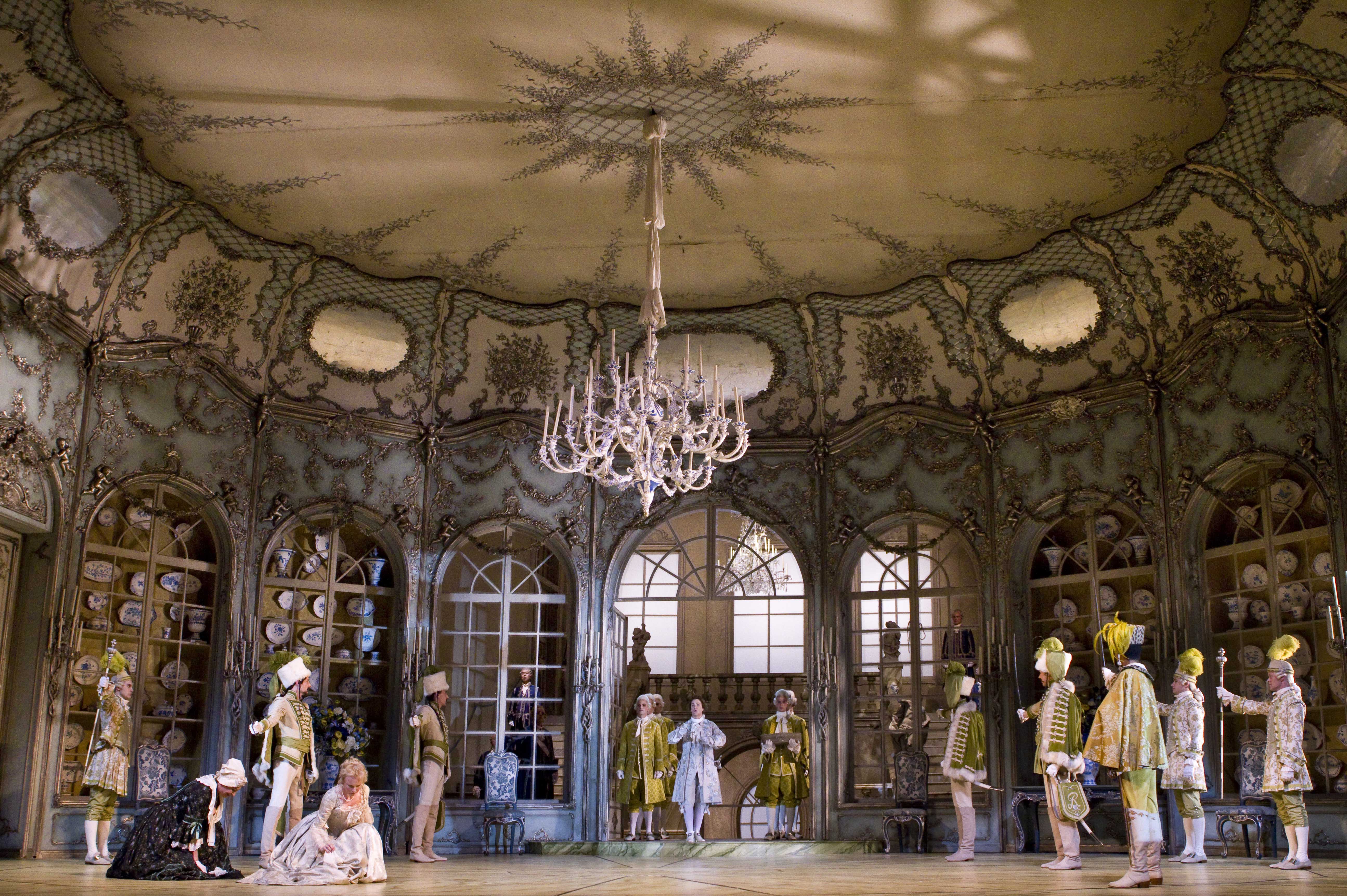 Au lever de rideau, on découvre l'émouvant décor de Jürgen Rose, inspiré des salons du Château de Nymphenburg de Munich. Décor chargé d'ornementations baroques jusqu'aux plâtres des plafonds. C'est donc dans l'ambiance de la moitié du dix-huitième siècle que se déroule l'action de ce Rosenkavalier. Etendus sur le lit, la Maréchale (Soile Isokoski) et Octavian (Alice Coote) se réveillent après une nuit d'amour. Pourtant empreint d'une musique sublimement écrite par Richard Strauss, le duo des chanteuses peine à convaincre de leur passion nocturne. Particulièrement du côté de Soile Isokoski qui, quoique magnifique vocalement, ne dégage aucune impression de la plénitude amoureuse dans laquelle elle se trouve. Elle manque de ce « je-ne-sais-quoi » d'érotisme, de voluptueux qui aurait éclairé le propos amoureux. De son côté, Alice Coote ne ménage pas son talent pour entrer dans son personnage transis d'amour. Elle y est parfaite. Théâtralement et vocalement. Mais, la sauce ne prend pas. Et petit à petit, l'ennui gagne. Décidément, il ne se passe rien sur cette scène !