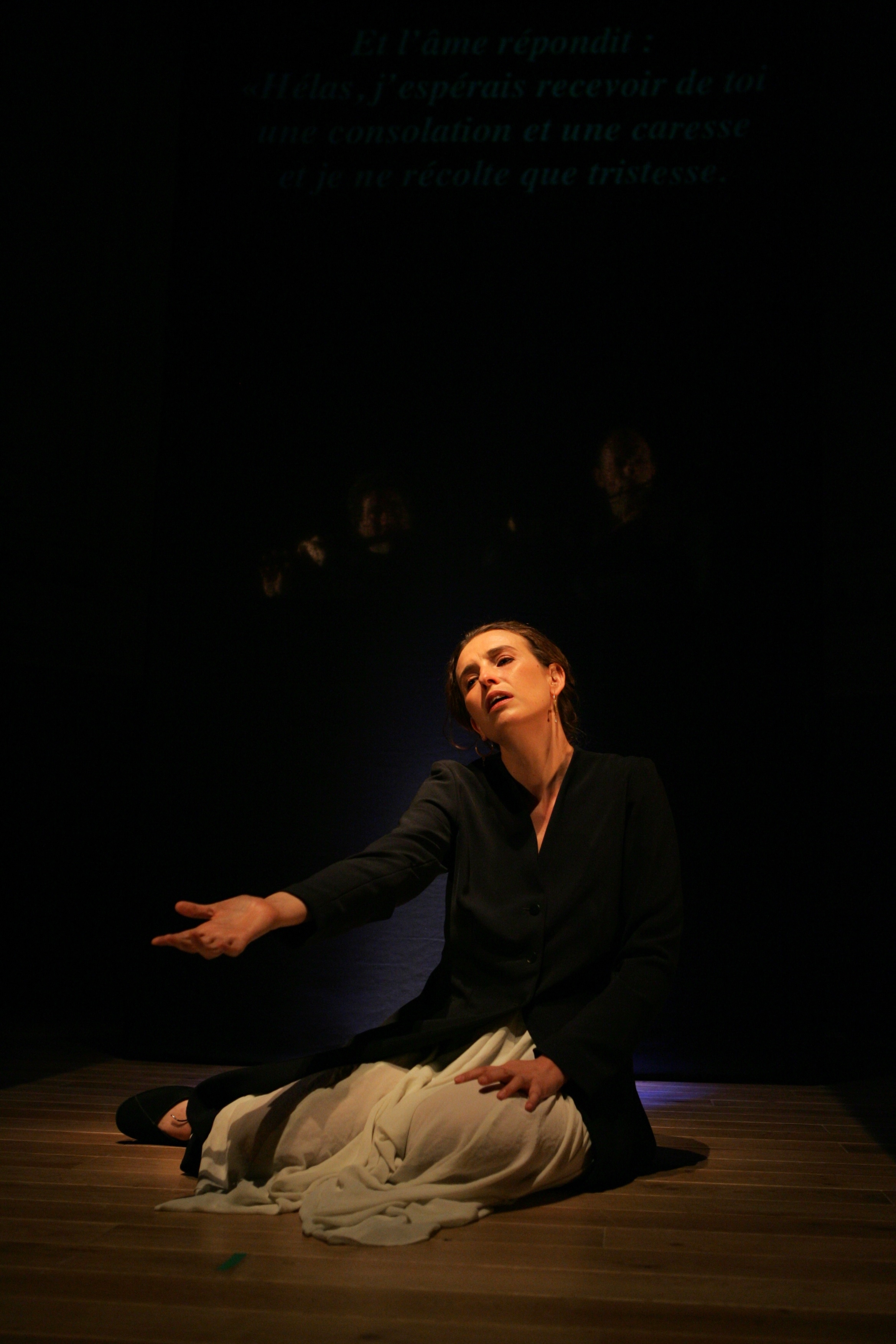 Le spectacle est tout de beauté concentrée. Le dispositif est épuré : devant le rideau de fer d'une Salle Garnier, qui, pour être accoutumée au « grand opéra », n'en a pas moins été un précieux écrin, le platea est nu, hormis un petit banc sis à jardin et un panneau tendu de tissu noir et presque adossé au rideau de fer. Un intelligent travail d'éclairage, majoritairement latéral, se joint à de sobres costumes actuels et à une temporalité dramaturgique contemplative pour magnifier le geste vocal. Par sa envoutante pureté, ramassée jusqu'à l'essentiel et créant un véritable suspens, ce spectacle a rejoint un idéal en cette démarche que fut, au Festival d'Aix-en-Provence, en 2002, la production du Carnet d'un disparu de Leoš Janáček par Claude Régy. Une figure allégorique unit ce spectacle, celle de la mandorle (ou amande) qui nourrit le vocabulaire pictural et sculptural médiéval et qui se matérialisé par la position des mains ou du corps.
