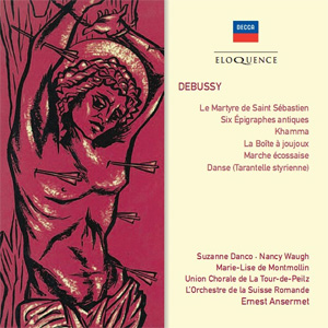 Le second album Debussy est particulièrement attractif en son programme. La musique intégrale du Martyre de Saint Sébastien, « mystère composé en rythme français par Gabriele d'Annunzio et joué à Paris sur la scène du Châtelet le 22 mai 1911, avec la musique de Claude Debussy » (tel est le titre complet de l'œuvre), handicapée par le texte verbeux, prolixe et désuet de d'Annunzio, a connu diverses incarnations au disque : Cluytens, Inghelbrecht, Bernstein s'y sont frottés avec plus ou moins de bonheur, en raison de l'utilisation plus ou moins complète du texte parlé. Ansermet adopte la solution radicale, mais ô combien heureuse pour la musique qui lui est nettement supérieure, de supprimer la totalité de ce texte parlé, même celui qui la couvre. Et l'initiative est particulièrement bienvenue en l'occurrence, par la qualité de ferveur et de transparence de l'exécution, illuminée par les superbes chœurs et les voix solistes féminines (admirable Suzanne Danco !) Par ailleurs, il est tout à fait adéquat d'y avoir joints des pages moins connues de Debussy, orchestrées par ses amis : les Six Épigraphes Antiques, le ballet Khamma, la pantomime La Boîte à Joujoux et la Tarentelle Styrienne, respectivement dans les orchestrations d'Ansermet, Koechlin, Caplet et Ravel, dont notre orfèvre de chef nous offre des interprétations véritablement scintillantes.